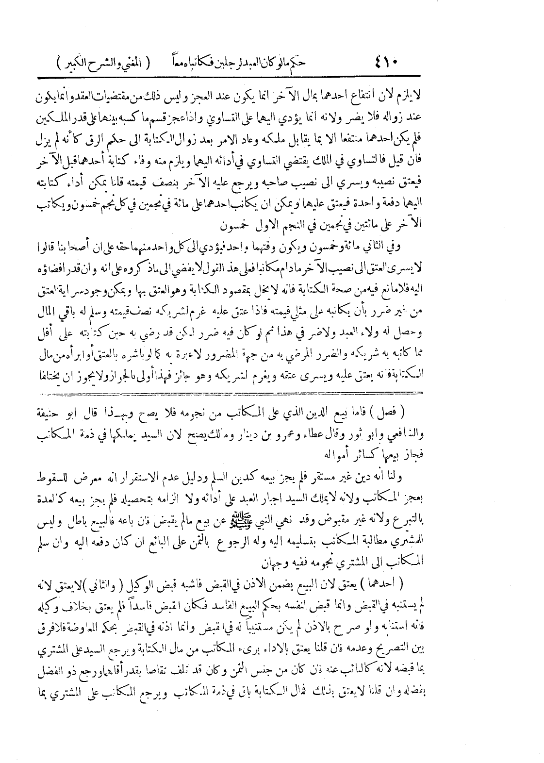 والشافعي وأبو ثور وقال عطاء وعمرو بن دينار ومالك يصح لأن السيد يملكها في ذمة المكاتب فجاز بيعها كسائر أمواله ولنا أنه دين غير مستقر فلم يجز بيعه كدين السلم ودليل عدم الاستقرار أنه معرض للسقوط بعجز المكاتب ولأنه لا يملك السيد إجبار العبد على أدائه ولا الزامه بتحصيله فلم يجز بيعه كالعدة بالتبرع ولأنه غير مقبوض وقد نهى النبي صلى الله عليه وسلم عن بيع ما لم يقبض فإن باعه فالبيع باطل وليس للمشتري مطالبة المكاتب بتسليمه إليه وله الرجوع بالثمن على البائع إن كان دفعه إليه وإن سلم المكاتب إلى المشتري نجومه ففيه وجهان (أحدهما) يعتق لأن البيع يضمن الإذن في القبض فأشبه قبض الوكيل (والثاني) لا يعتق لأنه لم يستنبه في القبض وإنما قبض لنفسه بحكم البيع الفاسد فكان القبض فاسداً فلم يعتق بخلاف وكيله فإنه استنابه ولو صرح بالإذن لم يكن مستنيباً له في القبض وإنما إذنه في القبض بحكم المعاوضة فلا فرق بين التصريح وعدمه فإن قلنا يعتق بالأداء برئ المكاتب من مال الكتابة ويرجع السيد على المشتري بما قبضه لانه كالنائب عنه فإن كان من جنس الثمن وكان قد تلف تقاصا بقدر أقلهما ورجع ذو الفضل بفضله وإن قلنا لا يعتق بذلك فمال الكتابة باق في ذمة المكاتب ويرجع المكاتب على المشتري بما