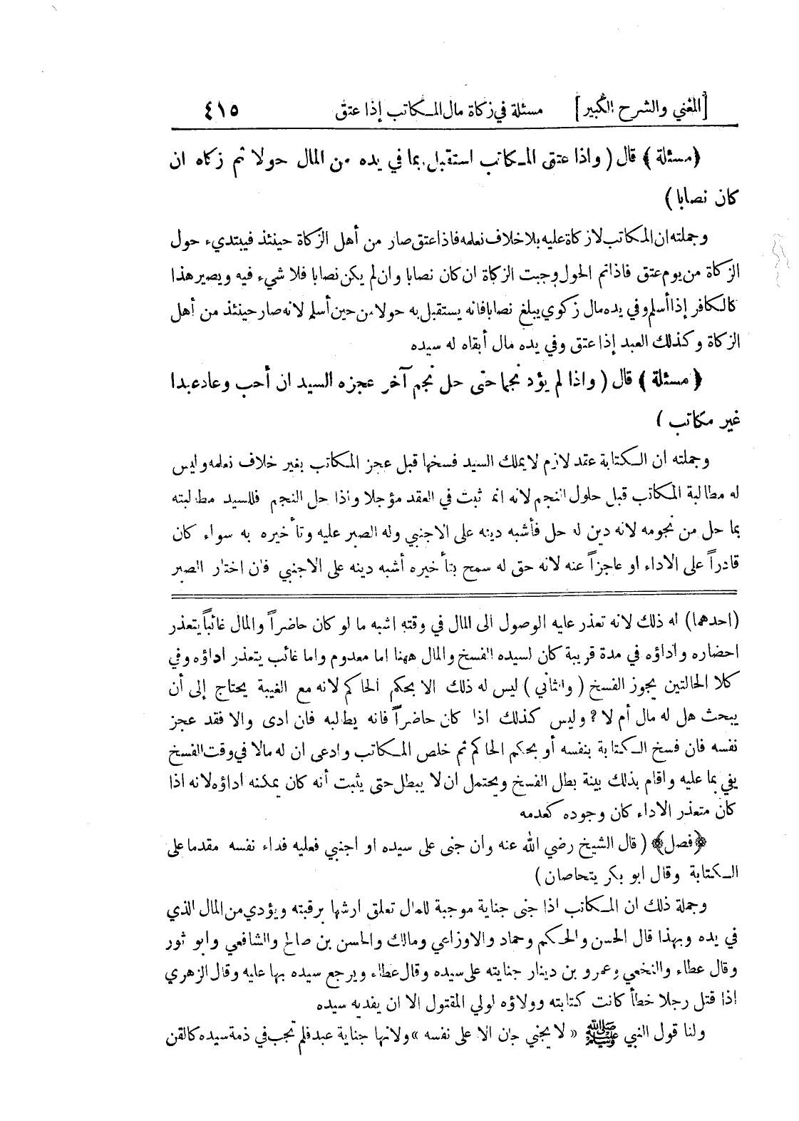 (أحدهما) له ذلك لأنه تعذر عليه الوصول إلى المال في وقته أشبه ما لو كان حاضراً والمال غائباً يتعذر إحضاره وأداؤه في مدة قريبة كان لسيده الفسخ والمال ههنا إما معدوم وإما غائب يتعذر أداؤه وفي كلا الحالتين يجوز الفسخ (والثاني) ليس له ذلك إلا بحكم الحاكم لأنه مع الغيبة يحتاج إلى أن يبحث هل له مال أم لا؟ وليس كذلك إذا كان حاضراً فإنه يطالبه فإن أدى وإلا فقد عجز نفسه فإن فسخ الكتابة بنفسه أو بحكم الحاكم ثم خلص المكاتب وادعى أن له مالاً في وقت الفسخ يفي بما عليه وأقام بذلك بينة بطل الفسخ ويحتمل أن لا يبطل حتى يثبت أنه كان يمكنه أداؤه لأنه إذا كان متعذر الأداء كان وجوده كعدمه (فصل) (قال الشيخ رضي الله عنه وإن جنى على سيده أو أجنبي فعليه فداء نفسه مقدماً على الكتابة وقال أبو بكر يتحاصان) وجملة ذلك أن المكاتب إذا جنى جناية موجبة للمال تعلق أرشها برقبته ويؤدي من المال الذي في يده وبهذا قال الحسن والحكم وحماد والاوزاعي ومالك والحسن بن صالح والشافعي وأبو ثور وقال عطاء والنخعي وعمرو بن دينار جنايته على سيده وقال عطاء ويرجع سيده بها عليه وقال الزهري