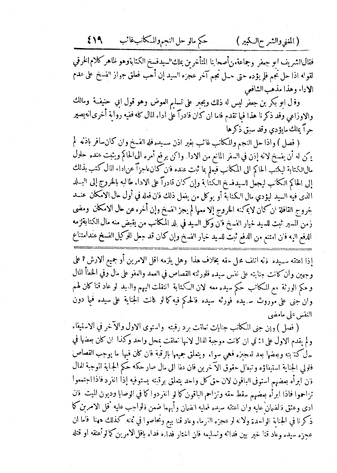 إذا اعتقه سيده فإنه أتلف محل حقه بخلاف هذا وهل يلزمه أقل الأمرين أو جميع الأرش؟ على وجهين وإن كانت جنايته على نفس سيده فلورثته القصاص في العمد والعفو على مال وفي الخطأ المال وحكم الورثة مع المكاتب حكم سيده معه لأن الكتابة انتقلت إليهم والعبد لو عاد قناً كان لهم وإن جني على موروث سيده فورثه سيده فالحكم فيه كما لو كانت الجناية على سيده فيما دون النفس على ما مضى (فصل) وإن جنى المكاتب جنايات تعلقت برد رقبته واستوى الأول والآخر في الاستيفاء ولم يقدم الأول على الثاني إن كانت موجبة للمال لأنها تعلقت بمحل واحد وكذا إن كان بعضها في حال كتابته وبعضها بعد تعجيزه فهي سواء ويتعلق جميعها بالرقبة فإن كان فيها ما يوجب القصاص فالولي الجناية استيفاؤه وتبطل حقوق الآخرين فإن عفا إلى مال صار حكمه حكم الجناية الموجبة للمال فإن أبرأه بعضهم استوفى الباقون لأن حق كل واحد يتعلق برقبته يستوفيه إذا انفرد فإذا اجتمعوا تزاحموا فإذا أبرأه بعضهم سقط حقه وتزاحم الباقون كما لو انفردوا كما في الوصايا وديون الميت فإن أدى وعتق فالضمان عليه وإن أعتقه سيده فعليه الضمان وأيهما ضمن فالواجب عليه أقل الأمرين كما ذكرنا في الجناية الواحدة ولأنه لو عجزه الغرماء وعاد قنا بيع وتحاصوا في ثمنه كذلك ههنا فأما إن عجزه سيده وعاد قناً خير بين فدائه وتسليمه فإن اختار فداءه فداه بأقل الامرين كما لو أعتقه أو قتله