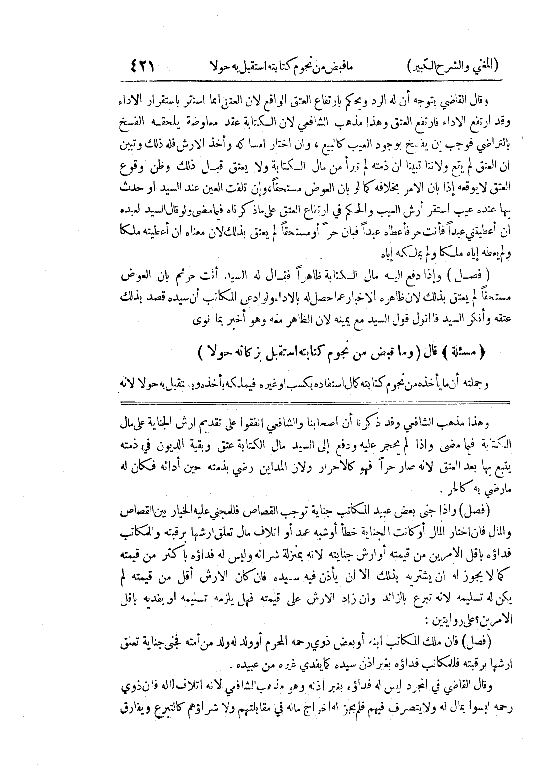 (فصل) وإذا جنى بعض عبيد المكاتب جناية توجب القصاص فللمجني عليه الخيار بين القصاص والمال فإن اختار المال أو كانت الجناية خطأ أو شبه عمد أو إتلاف مال تعلق أرشها برقبته وللمكاتب فداؤه بأقل الأمرين من قيمته أو أرش جنايته لأنه بمنزلة شرائه وليس له فداؤه بأكثر من قيمته كما لا يجوز له أن يشتريه بذلك إلا أن يأذن فيه سيده فإن كان الأرش أقل من قيمته لم يكن له تسليمه لأنه تبرع بالزائد وإن زاد الأرش على قيمته فهل يلزمه تسليمه أو يفديه باقل الامين؟ على روايتين:
