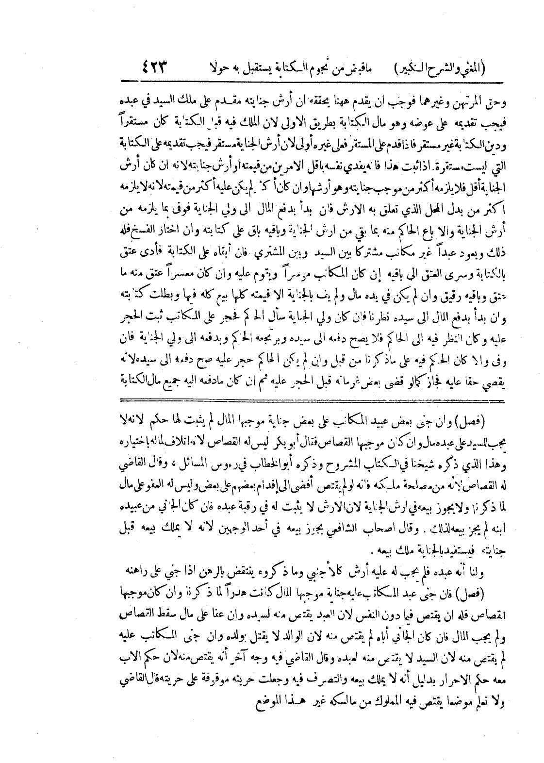 ولنا أنه عبده فلم يجب له عليه أرش كالأجنبي وما ذكروه ينتقض بالرهن إذا جنى على راهنه (فصل) فإن جنى عبد المكاتب عليه جناية موجبها المال كانت هدراً لما ذكرنا وإن كان موجبها القصاص فله ان يقتض فيما دون النفس لأن العبد يقتص منه لسيده وإن عفا على مال سقط القصاص ولم يجب المال فإن كان الجاني أباه لم يقتص منه لأن الوالد لا يقتل بولده وإن جنى المكاتب عليه لمى يقتص منه لأن السيد لا يقتص منه لعبده وقال القاضي فيه وجه آخر أنه يقتص منه لأن حكم الأب معه حكم الأحرار بدليل أنه لا يملك بيعه والتصرف فيه وجعلت حريته موقوفة على حريته قال القاضي ولا نعلم موضعاً يقتص فيه المملوك من مالكه غير هذا الموضع
