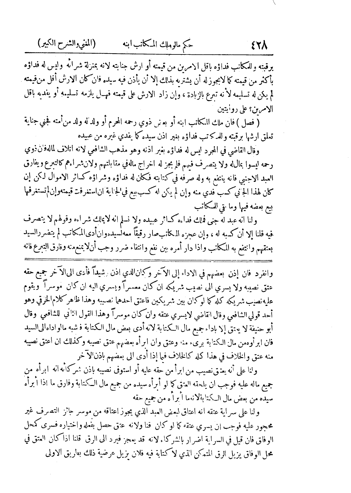 وانفرد فإن أذن بعضهم في الأداء إلى الآخر وكان الدي اذن رشيدا فأذى إلى الآخر جميع حقه عتق نصيبه ولا يسري إلى نصيبه شريكه إن كان معسراً ويسري إليه إن كان موسراً ويقوم عليه نصيب شريكه كله كما لو كان بين شريكين فأعتق أحدهما نصيبه وهذا ظاهر كلام الخرقي وهو أحد قولي الشافعي وقال القاضي لا يسري عتقه وإن كان موسراً وهذا القول الثاني للشافعي وقال أبو حنيفة لا يعتق إلا بأداء جميع مال الكتابة لأنه أدى بعض مال الكتابة فأشبه ما لو أداه إلى السيد فإن ابرأوه من مال الكتابة برئ منه وعتق وإن ابرأه بعضهم عتق نصيبه وكذلك إن أعتق نصيبه منه عتق والخلاف في هذا كله كالخلاف فيما إذا أدى إلى بعضهم بإذن الآخر ولنا على أنه يعتق نصيب من أبرأ من حقه عليه أو استوفى نصيبه بإذن شركائه أنه ابرأه من جميع ماله عليه فوجب أن يلحقه العتق كما لو أبرأه سيده من جميع مال الكتابة وفارق ما إذا أبرأه سيده من بعض مال الكتابة لأنه ما أبرأه من جميع حقه ولنا على سراية عتقه أنه إعتاق لبعض العبد الذي يجوز إعتاقه من موسر جائز التصرف غير محجور عليه فوجب أن يسري عتقه كما لو كان قناً ولأنه عتق حصل بفعله واختياره فسرى كمحل الوفاق فإن قيل في السراية اضرار بالشركاء لأنه قد يعجز فيرد إلى الرق قلنا إذا كان العتق في محل الوفاق يزيل الرق المتمكن الذي لا كتابة فيه فلأن يزيل عرضية ذلك بطريق الأولى