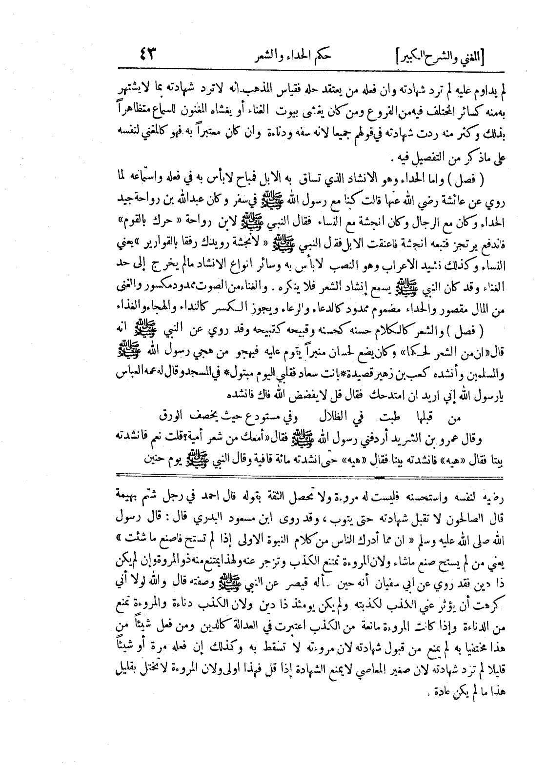 قال الصالحون لا تقبل شهادته حتى يتوب، وقد روى ابن مسعود البدري قال: قال رسول الله صلى الله عليه وسلم (إن مما أدرك الناس من كلام النبوة الأولى إذا لم تستح فاصنع ما شئت) يعني من لم يستح صنع ما شاء ولان المروءة تمتنع الكذب وتزجر عنه ولهذا يمتنع منه دو المروة وإن لم يكن ذا دين فقد روي عن أبي سفيان أنه حين سأله قيصر عن النبي صلى الله عليه وسلم وصفته قال والله لولا أني كرهت أن يؤثر عني الكذب لكذبته ولم يكن يومئذ ذا دين ولأن الكذب دناءة والمروءة تمنع من الدناءة وإذا كانت المروءة مانعة من الكذب اعتبرت في العدالة كالدين ومن فعل شيئاً من هذا مختفياً به لم يمنع من قبول شهادته لأن مروءته لا تسقط به وكذلك إن فعله مرة أو شيئاً قليلاً لم ترد شهادته لأن صغير المعاصي لا يمنع الشهادة إذا قل فهذا أولى ولأن المروءة لا تختل بقليل هذا ما لم يكن عادة