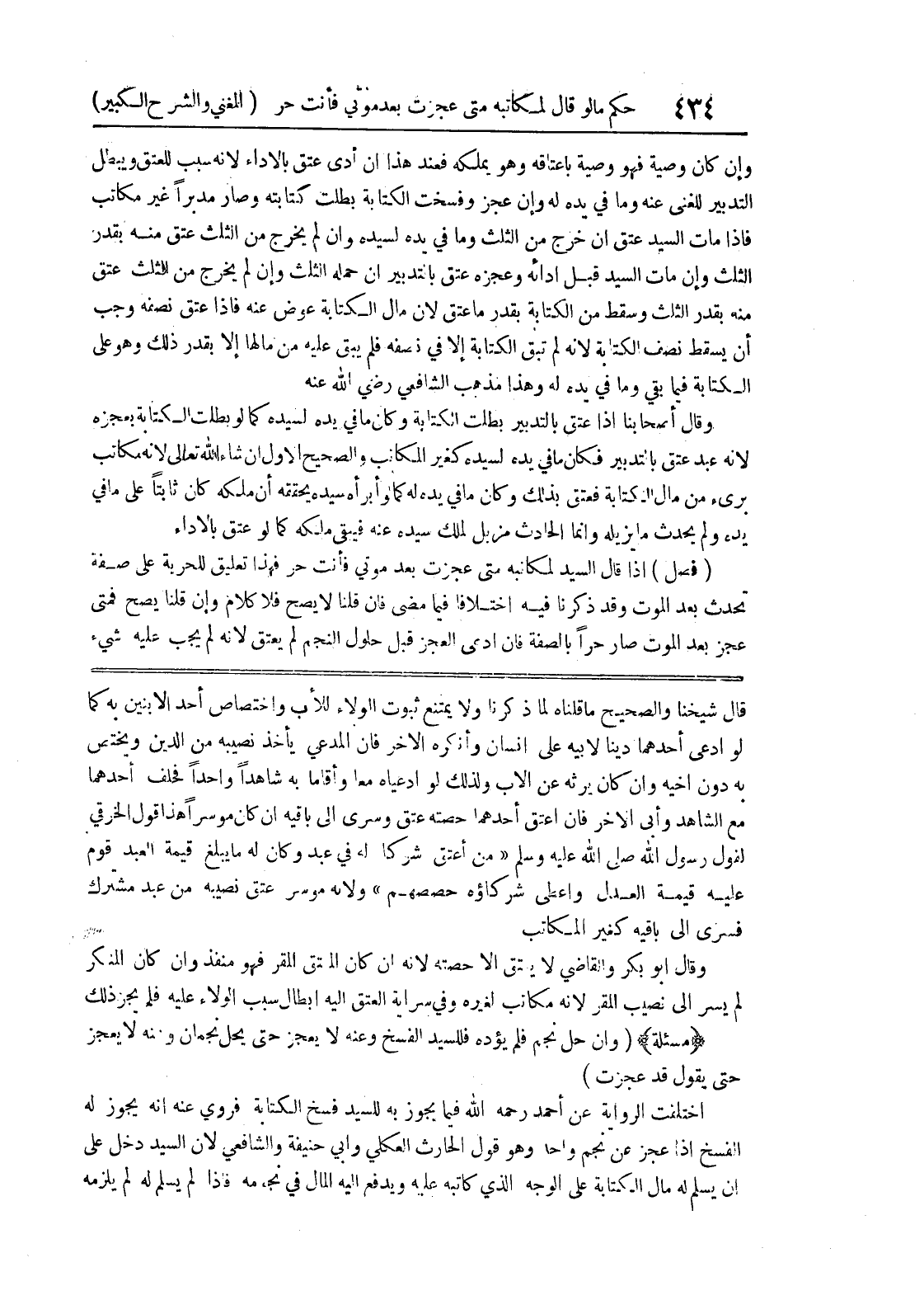 قال شيخنا والصحيح ما قلناه لما ذكرنا ولا يمتنع ثبوت الولاء للأب واختصاص أحد الابنين به كما لو أدعى أحدهما ديناً لأبيه على إنسان وأنكره الآخر فإن المدعي يأخذ نصيبه من الدين ويختص به دون أخيه وإن كان يرثه عن الأب ولذلك لو ادعياه معا وأقاما به شاهداً وأحداً فحلف أحدهما مع الشاهد وأبى الآخر فإن أعتق أحدهما حصته عتق وسرى إلى باقيه إن كان موسراً هذا قول الخرقي لقول رسول الله صلى الله عليه وسلم (من أعتق شركا له في عبد وكان له ما يبلغ قيمة العبد قوم عليه قيمة العدل وأعطي شركاؤه حصصهم) ولأنه موسر عتق نصيبه من عبد مشترك فسرى إلى باقيه كغير المكاتب وقال أبو بكر والقاضي لا يعتق إلا حصته لأنه إن كان المعتق المقر فهو منفذ وإن كان المنكر لم يسر إلى نصيب المقر لأنه مكاتب لغيره وفي سراية العتق إليه إبطال سبب الولاء عليه فلم يجز ذلك (مسألة) (وإن حل نجم فلم يؤده فللسيد الفسخ وعنه لا يعجز حتى يحل نجمان وعنه لا يعجز حتى يقول قد عجزت) اختلفت الرواية عن أحمد رحمه الله فيما يجوز به للسيد فسخ الكتابة فروي عنه أنه يجوز له الفسخ إذا عجز عن نجم واحد وهو قول الحارث العكلي وابي حنيفة والشافعي لأن السيد دخل على أن يسلم له مال الكتابة على الوجه الذي كاتبه عليه ويدفع إليه المال في نجومه فإذا لم يسلم له لم يلزمه
