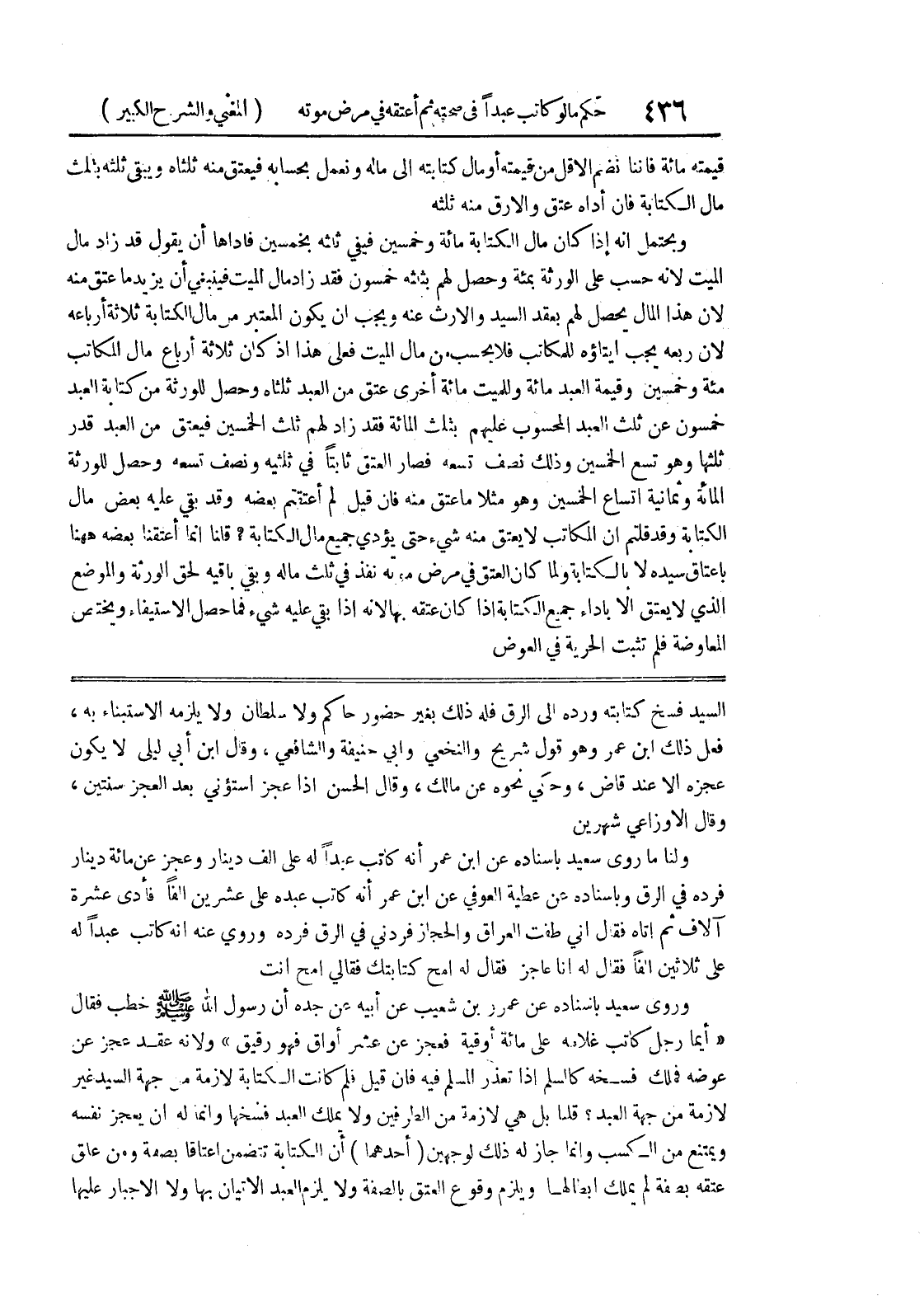 السيد فسخ كتابته ورده إلى الرق فله ذلك بغير حضور حاكم ولا سلطان ولا يلزمه الاستبناء به، فعل ذلك ابن عمر وهو قول شريح والنخعي وأبي حنيفة والشافعي، وقال ابن أبي ليلى لا يكون عجزه إلا عند قاض، وحكي نحوه عن مالك، وقال الحسن إذا عجز استؤني بعد العجز سنتين، وقال الأوزاعي شهرين ولنا ما روى سعيد بإسناده عن ابن عمر أنه كاتب عبداً له على ألف دينار وعجز عن مائة دينار فرده في الرق وبإسناده عن عطية العوفي عن ابن عمر أنه كاتب عبده على عشرين ألفاً فأدى عشرة آلاف ثم أتاه فقال إني طفت العراق والحجاز فردني في الرق فرده وروي عنه أنه كاتب عبداً له