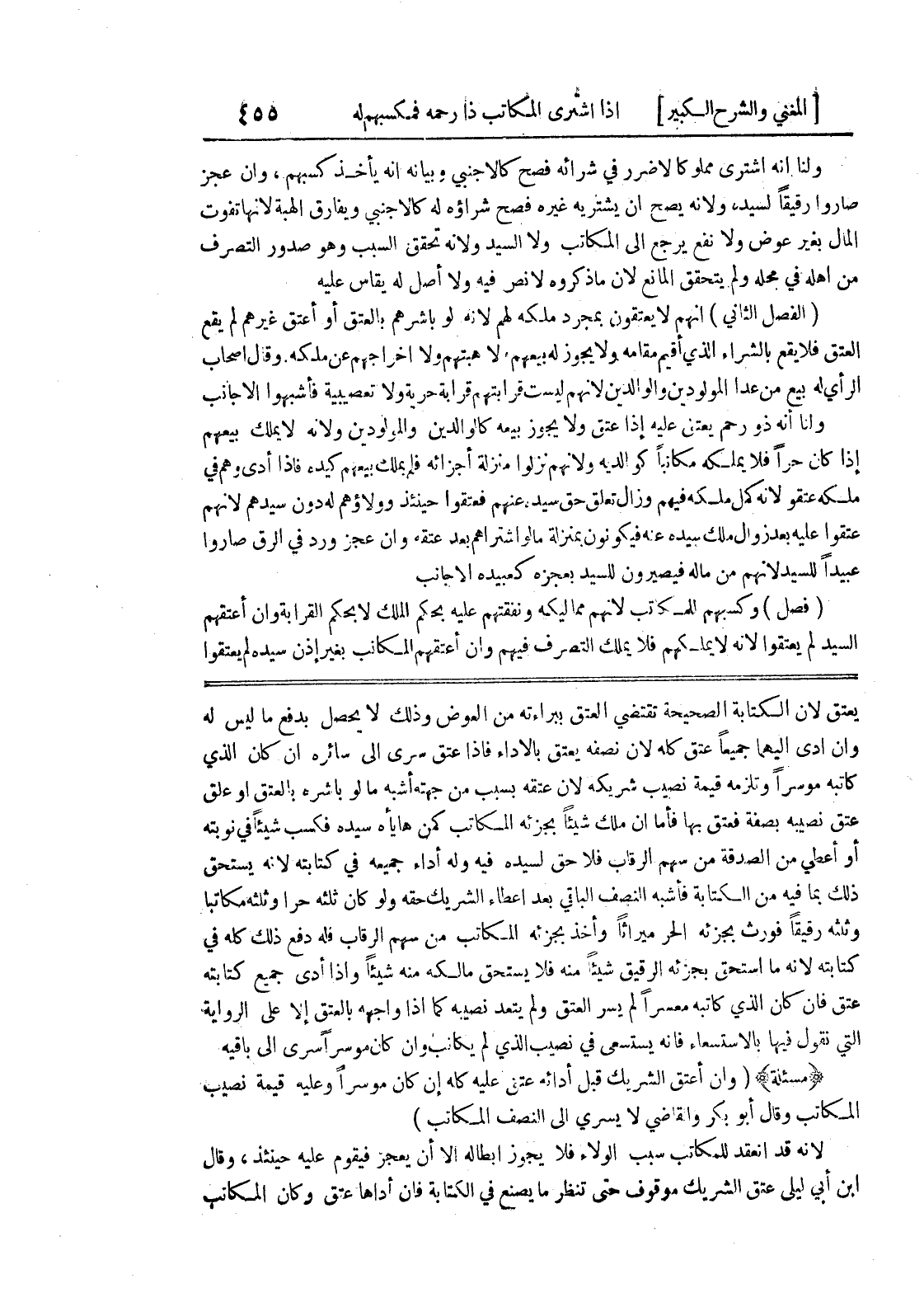 يعتق لأن الكتابة الصحيحة تقتضي العتق ببراءته من العوض وذلك لا يحصل بدفع ما ليس له وإن أدى إليهما جميعاً عتق كله لأن نصفه يعتق بالأداء فإذا عتق سرى إلى سائره ان كان الذي كاتبه موسراً وتلزمه قيمة نصيب شريكه لأن عتقه بسبب من جهته أشبه ما لو باشره بالعتق أو علق عتق نصيبه بصفة فعتق بها فأما إن ملك شيئاً بجزئه المكاتب كمن هايأه سيده فكسب شيئاً في نوبته أو أعطي من الصدقة من سهم الرقاب فلا حق لسيده فيه وله أداء جميعه في كتابته لأنه يستحق ذلك بما فيه من الكتابة فأشبه النصف الباقي بعد إعطاء الشريك حقه ولو كان ثلثه حراً وثلثه مكاتباً وثلثه رقيقاً فورث بجزئه الحر ميراثاً وأخذ بجزئه المكاتب من سهم الرقاب فله دفع ذلك كله في كتابته لأنه ما استحق بجزئه الرقيق شيئاً منه فلا يستحق مالكه منه شيئاً وإذا أدى جميع كتابته عتق فإن كان الذي كاتبه معسراً لم يسر العتق ولم يتعد نصيبه كما إذا واجهه بالعتق إلا على الرواية التي نقول فيها بالاستسعاء فإنه يستسعى في نصيب الذي لم يكاتب وإن كان موسراً سرى إلى باقيه (مسألة) (وإن أعتق الشريك قبل أدائه عتق عليه كله إن كان موسراً وعليه قيمة نصيب المكاتب وقال أبو بكر والقاضي لا يسري إلى النصف المكاتب) لأنه قد انعقد للمكاتب سبب الولاء فلا يجوز ابطاله إلا أن يعجز فيقوم عليه حينئذ، وقال ابن أبي ليلى عتق الشريك موقوف حتى تنظر ما يصنع في الكتابة فإن أداها عتق وكان المكاتب