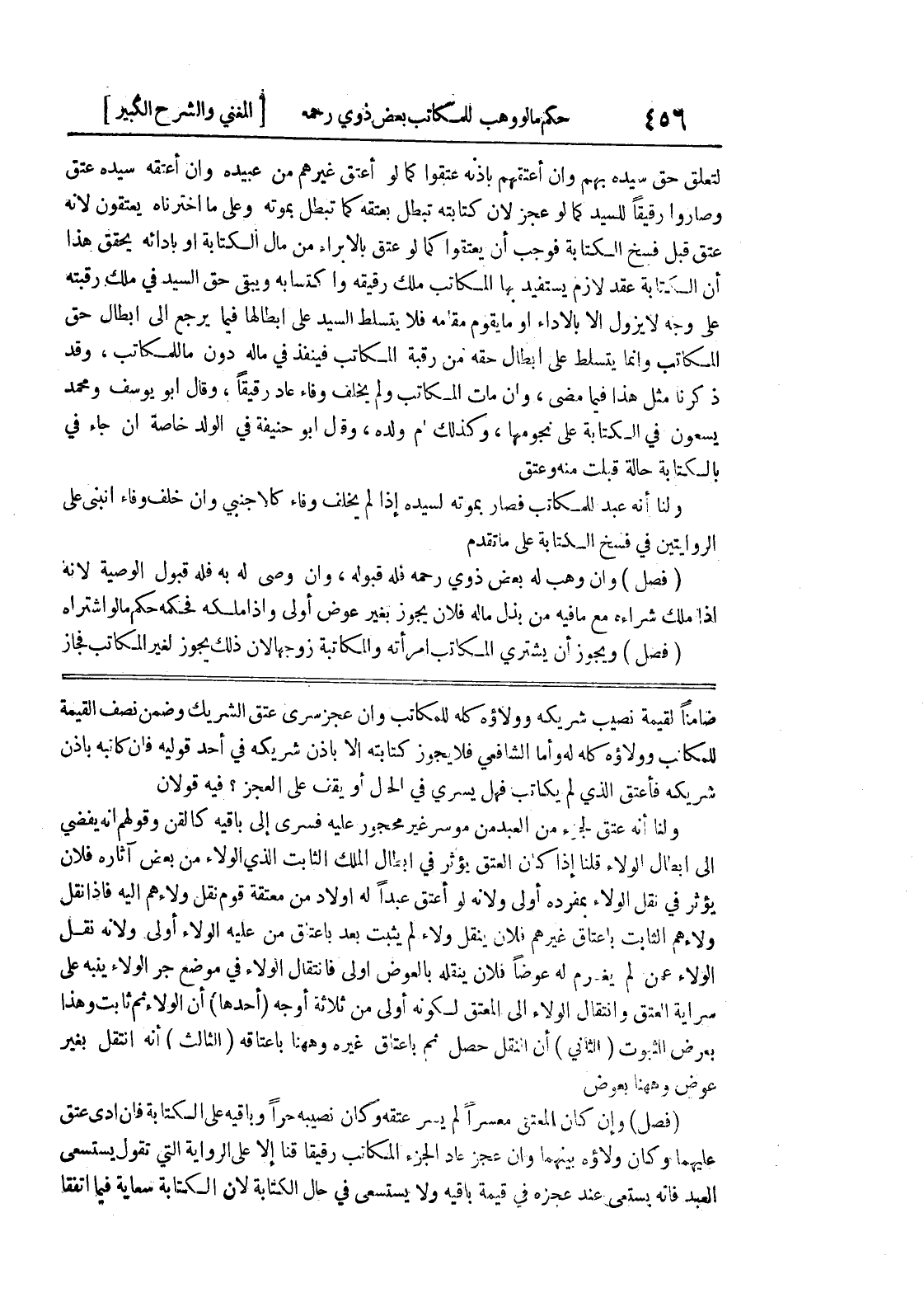 ضامناً لقيمة نصيب شريكه وولاؤه كله للمكاتب وإن عجز سرى عتق الشريك وضمن نصف القيمة للمكاتب وولاؤه كله له وأما الشافعي فلا يجوز كتابته إلا بإذن شريكه في أحد قوليه فإن كاتبه بإذن شريكه فأعتق الذي لم يكاتب فهل يسري في الحال أو يقف على العجز؟ فيه قولان ولنا أنه عتق لجزء من العبد من موسر غير محجور عليه فسرى إلى باقيه كالقن وقولهم إنه يفضي إلى إبطال الولاء قلنا إذا كان العتق يؤثر في إبطال الملك الثابت الذي الولاء من بعض آثاره فلأن يؤثر في نقل الولاء بمفرده أولى ولأنه لو أعتق عبداً له أولاد من معتقة قوم نقل ولاءهم إليه فإذا نقل ولاءهم الثابت بإعتاق غيرهم فلأن ينقل ولاء لم يثبت بعد بإعتاق من عليه الولاء أولى ولأنه نقل الولاء عمن لم يغرم له عوضاً فلأن ينقله بالعوض أولى فانتقال الولاء في موضع جر الولاء ينبه على سراية العتق وانتقال الولاء إلى المعتق لكونه أولى من ثلاثة أوجه (أحدها) أن الولاء ثم ثابت وهذا بعرض الثبوت (الثاني) أن النقل حصل ثم يا عتاق غيره وههنا بإعتاقه (الثالث) أنه انتقل بغير عوض وههنا بعوض (فصل) وإن كان المعتق معسراً لم يسر عتقه وكان نصيبه حراً وباقيه على الكتابة فإن أدى عتق عليهما وكان ولاؤه بينهما وإن عجز عاد الجزء المكاتب رقيقاً قناً إلا على الرواية التي تقول يستسعى العبد فانه يستعى عند عجزه في قيمة باقيه ولا يستسعى في حال الكتابة لأن الكتابة سعاية فيما اتفقا