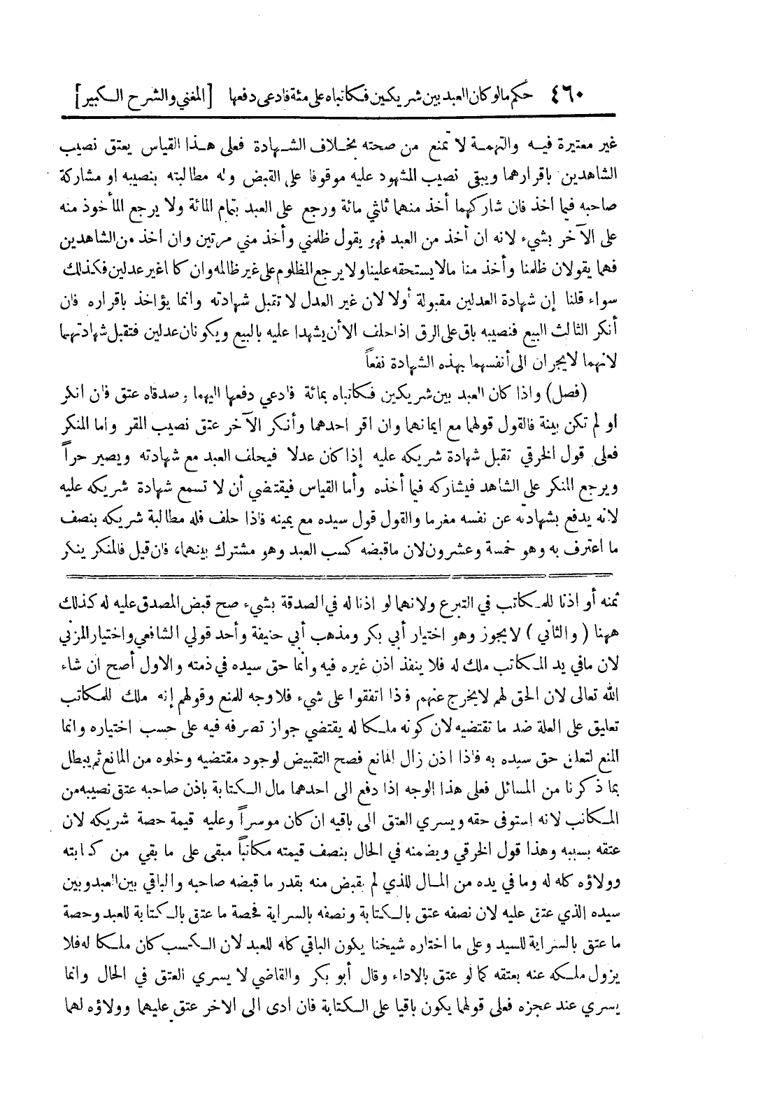 المكاتب لأنه استوفى حقه ويسري العتق إلى باقيه إن كان موسراً وعليه قيمة حصة شريكه لأن عتقه بسببه وهذا قول الخرقي ويضمنه في الحال بنصف قيمته مكاتباً مبقى على ما بقي من كتابته وولاؤه كله له وما في يده من المال للذي لم بقبض منه بقدر ما قبضه صاحبه والباقي بين العبد وبين سيده الذي عتق عليه لان نصفه عتق بالكتابة ونصفه بالسراية فحصة ما عتق بالكتابة للعبد وحصة ما عتق بالسراية للسيد وعلى ما اختاره شيخنا يكون الباقي كله للعبد لأن الكسب كان ملكاً له فلا يزول ملكه عنه بعتقه كما لو عتق بالأداء وقال أبو بكر والقاضي لا يسري العتق في الحال وإنما يسري عند عجزه فعلى قولهما يكون باقياً على الكتابة فإن أدى إلى الآخر عتق عليهما وولاؤه لهما