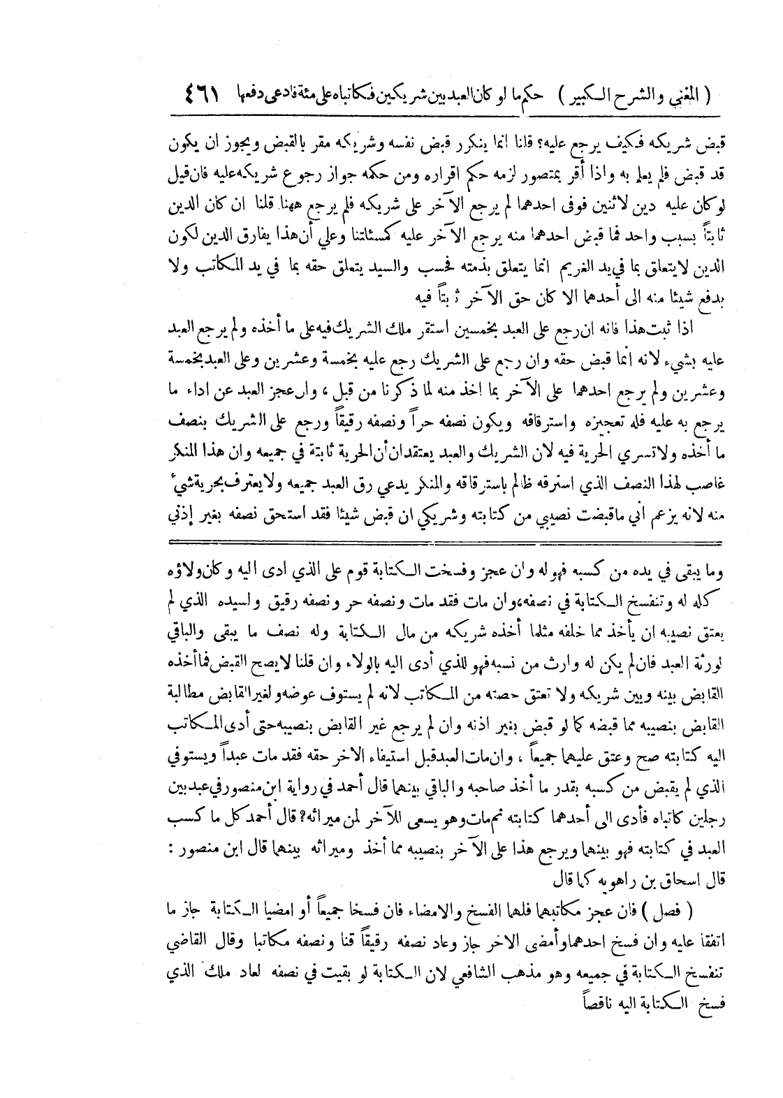 وما يبقى في يده من كسبه فهو له وإن عجز وفسخت الكتابة قوم على الذي أدى إليه وكان ولاؤه كله له وتنفسخ الكتابة في نصفه، وإن مات فقد مات ونصفه حر ونصفه رقيق ولسيده الذي لم يعتق نصيبه أن يأخذ مما خلفه مثلما أخذه شريكه من مال الكتابة وله نصف ما يبقى والباقي لورثة العبد فإن لم يكن له وارث من نسبه فهو للذي أدى إليه بالولاء وإن قلنا لا يصح القبض فما أخذه القابض بينه ويين شريكه ولا تعتق حصته من المكاتب لأنه لم يستوف عوضه ولغير القابض مطالبة القابض بنصيبه مما قبضه كما لو قبض بغير إذنه وإن لم يرجع غير القابض بنصيبه حتى أدى المكاتب إليه كتابته صح وعتق عليهما جميعاً، وإن مات العبد قبل استيفاء الآخر حقه فقد مات عبداً ويستوفي الذي لم يقبض من كسبه بقدر ما أخذ صاحبه والباقي بينهما قال أحمد في رواية ابن منصور في عبد بين رجلين كاتباه فأدى إلى أحدهما كتابته ثم مات وهو يسعى للآخر لمن ميراثه؟ قال أحمد كل ما كسب العبد في كتابته فهو بينهما ويرجع هذا على الآخر بنصيبه مما أخذ وميراثه بينهما قال ابن منصور: قال اسحاق بن راهويه كما قال (فصل) عجز مكاتبهما فلهما الفسخ والإمضاء فإن فسخا جميعاً أو أمضيا الكتابة جاز ما اتفقا عليه وإن فسخ أحدهما وأمضى الآخر جاز وعاد نصفه رقيقاً قناً ونصفه مكاتباً وقال القاضي تنفسخ الكتابة في جميعه وهو مذهب الشافعي لأن الكتابة لو بقيت في نصفه لعاد ملك الذي