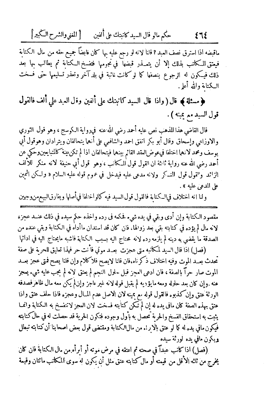 وإن كان بعد حلوله ومعه ما يؤديه لم يقبل قوله لأنه غير عاجز وإن لم يكن معه مال ظاهر فصدقه الورثة عتق وإن كذبوه فالقول قوله مع يمينه لأن الأصل عدم المال وعجزه فإذا حلف عتق وإذا عتق بهذه الصفة كان ما في يده له إن لم تكن كتابته فسخت لأن العجز لا تنفسخ به الكتابة وإنما يثبت به استحقاق الفسخ والحرية تحصل به بأول وجوده فتكون الحرية قد حصلت له في حال كتابته فيكون ما في يده له كما لو عتق بالإبراء من مال الكتابة ومقتضى قول بعض أصحابنا أن كتابته تبطل ويكون ما في يده لورثة سيده (فصل) إذا كاتب عبداً في صحته ثم أعتقه في مرض موته أو أبرأه من مال الكتابة فإن كان