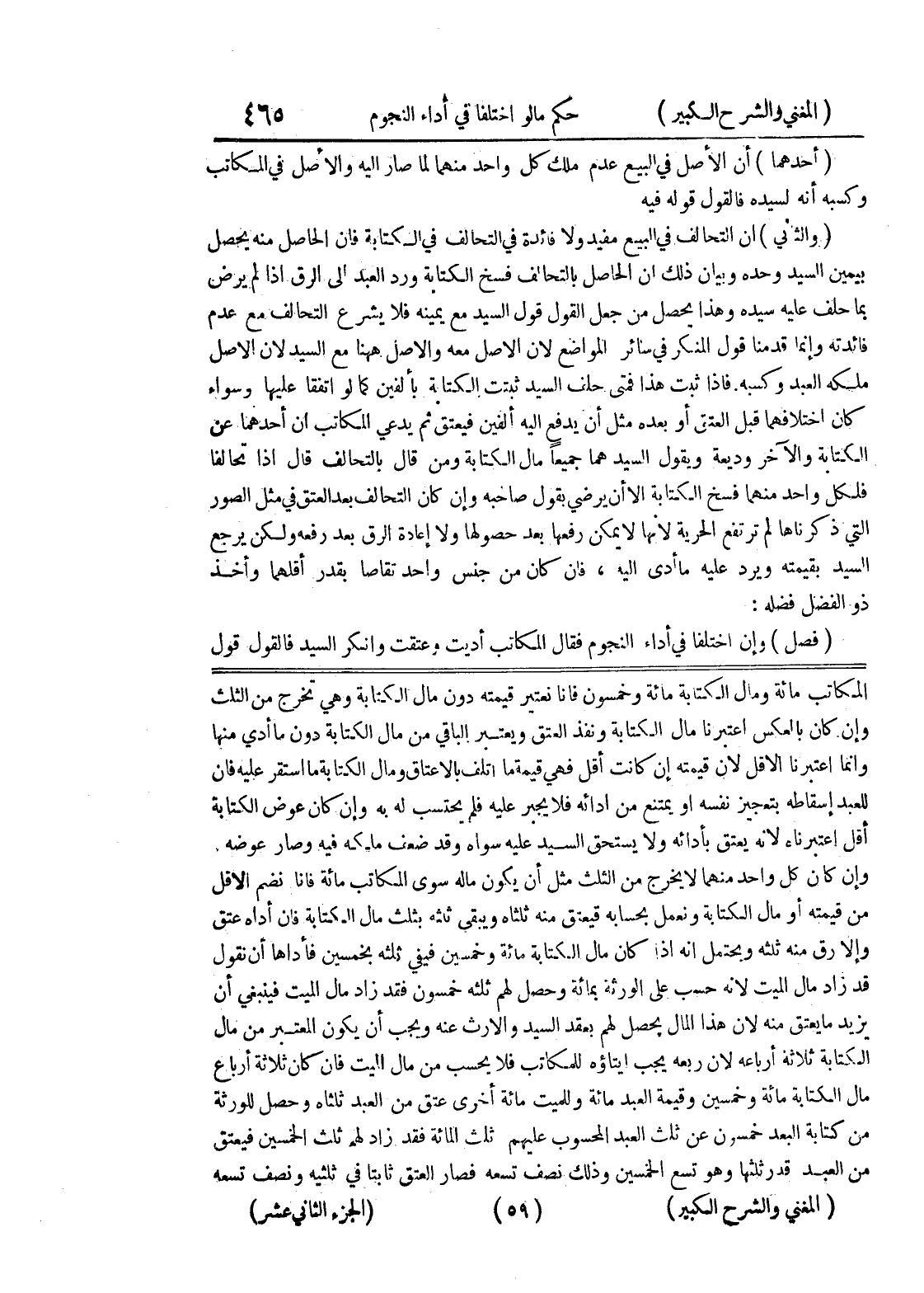المكاتب مائة ومال الكتابة مائة وخمسة فانا نعتير قيمته دون مال الكتابة وهي تخرج من الثلث وإن كان بالعكس اعتبرنا مال الكتابة ونفذ العتق ويعتبر الباقي من مال الكتابة دون ما أدي منها وإنما اعتبرنا الأقل لأن قيمته إن كانت أقل فهي قيمة ما أتلف بالإعتاق ومال الكتابة ما استقر عليه فإن للعبد إسقاطه بتعجيز نفسه أو يمتنع من أدائه فلا يجبر عليه فلم يحتسب له به وإن كان عوض الكتابة أقل اعتبرناه لأنه يعتق بأدائه ولا يستحق السيد عليه سواه وقد ضعف ملكه فيه وصار عوضه وإن كان كل واحد منهما لا يخرج من الثلث مثل أن يكون ماله سوى المكاتب مائة فإنا نضم الأقل من قيمته أو مال الكتابة ونعمل بحسابه قيعتق منه ثلثاه ويبقى ثلثه بثلث مال الكتابة فإن أداه عتق وإلا رق منه ثلثه ويحتمل أنه إذا كان مال الكتابة مائة وخمسين فيفي ثلثه بخمسين فأداها أن نقول قد زاد مال الميت لأنه حسب على الورثة بمائة وحصل لهم ثلثه خمسون فقد زاد مال الميت فينبغي أن يزيد ما يعتق منه لأن هذا المال يحصل لهم بعقد السيد والإرث عنه ويجب أن يكون المعتبر من مال الكتابة ثلاثة أرباعه لأن ربعه يجب إيتاؤه للمكاتب فلا يحسب من مال الميت فإن كان ثلاثة أرباع مال الكتابة مائة وخمسين وقيمة العبد مائة وللميت مائة أخرى عتق من العبد ثلثاه وحصل للورثة من كتابة البعد خمسون عن ثلث العبد المحسوب عليهم ثلث المائة فقد زاد لهم ثلث الخمسين فيعتق من العبد قدر ثلثها وهو تسع الخمسين وذلك نصف تسعه فصار العتق ثابتاً في ثلثيه ونصف تسعه
