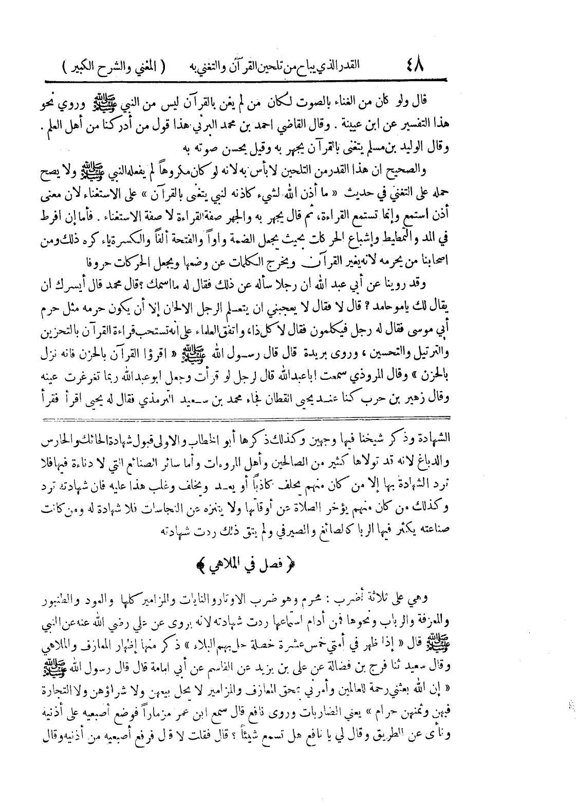 الشهادة وذكر شيخنا فيها وجهين وكذلك ذكرها أبو الخطاب والأولى قبول شهادة الحائك والحارس والدباغ لأنه قد تولاها كثير من الصالحين وأهل المروءات وأما سائر الصنائع التي لا دناءة فيها فلا ترد الشهادة بها إلا من كان منهم يحلف كاذباً أو يعد ويخلف وغلب هذا عليه فإن شهادته ترد وكذلك من كان منهم يؤخر الصلاة عن أوقاتها ولا يتنزه عن النجاسات فلا شهادة له ومن كانت صناعته يكثر فيها الربا كالصائغ والصيرفي ولم يتق ذلك ردت شهادته (فصل في الملاهي) وهي على ثلاثة أضرب: محرم وهو ضرب الأوتار والنايات والمزامير كلها والعود والطنبور والمعزفة والرباب ونحوها فمن أدام استماعها ردت شهادته لأنه بروى عن علي رضي الله عنه عن النبي صلى الله عليه وسلم قال (إذا ظهر في أمتي خمس عشرة خصلة حل بهم البلاء) ذكر منها إظهار المعارف والملاهي وقال سعيد ثنا فرج بن فضالة عن علي بن يزيد عن القاسم عن أبي أمامة قال قال رسول الله صلى الله عليه وسلم (إن الله بعثني رحمة للعالمين وأمرني بمحق المعازف والمزامير لا يحل بيعهن ولا شراؤهن ولا التجارة فيهن وثمنهن حرام) يعني الضاربات وروى نافع قال سمع ابن عمر مزماراً فوضع اصبعيه على أذنيه ونأى عن الطريق وقال لي يا نافع هل تسمع شيئاً؟ قال فقلت لا قال فرفع اصبعيه من أذنيه وقال