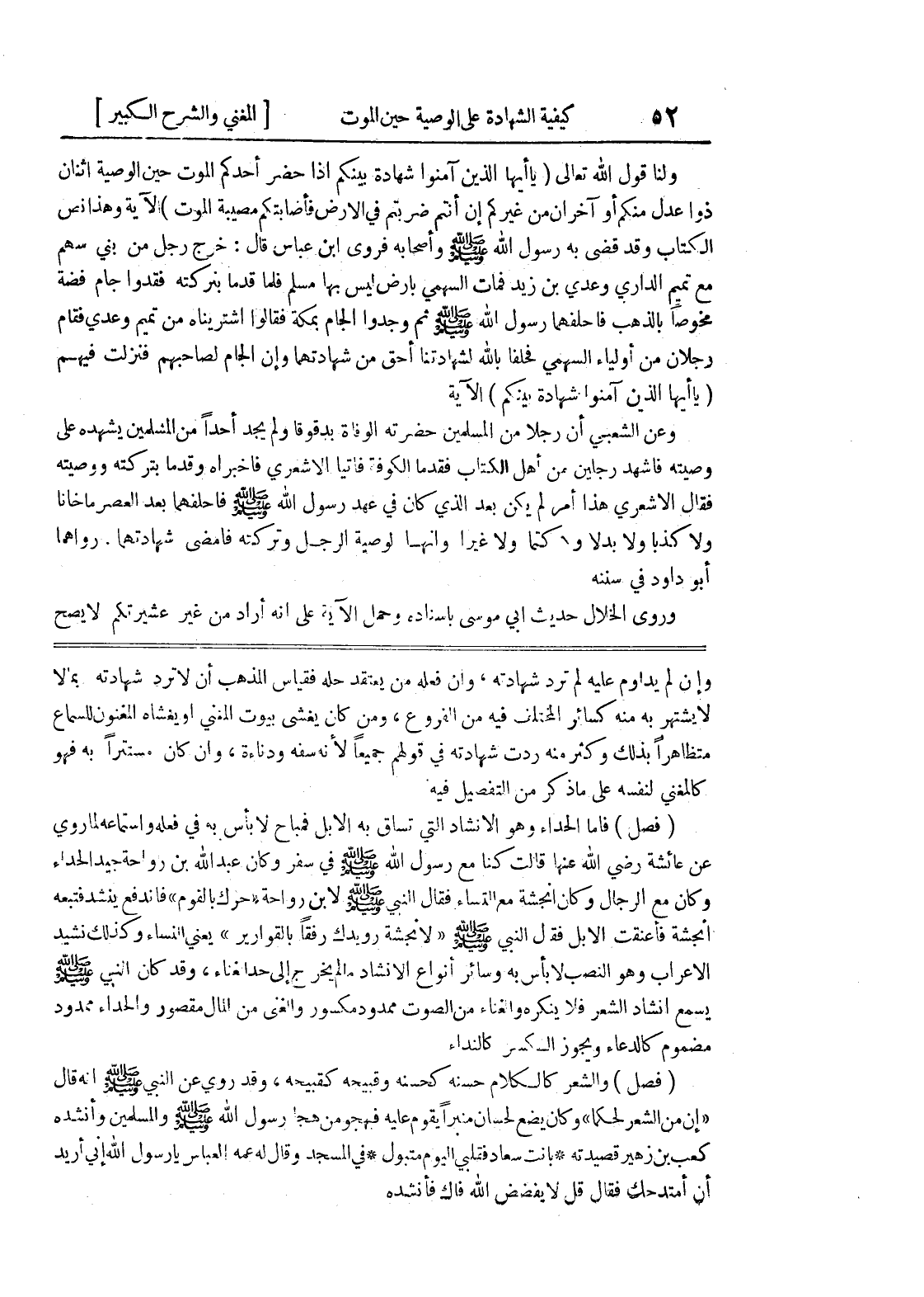 كالمغني لنفسه على ما ذكر من التفصيل فيه (فصل) فأما الحداء وهو الإنشاد التي تساق به الإبل فمباح لا بأس به في فعله واستماعه لما روي عن عائشة رضي الله عنها قالت كنا مع رسول الله صلى الله عليه وسلم في سفر وكان عبد الله بن رواحة جيد الحداء وكان مع الرجال وكان انجشة مع التساء فقال النبي صلى الله عليه وسلم لابن رواحة (حرك بالقوم) فاندفع ينشد فتبعه انجشة فأعنقت الإبل فقال النبي صلى الله عليه وسلم (لا نجشة رويدك رفقاً بالقوارير) يعني النساء وكذلك نشيد الأعراب وهو النصب لا بأس به وسائر أنواع الإنشاد ما لم يخرج إلى حد الغناء، وقد كان النبي صلى الله عليه وسلم يسمع إنشاد الشعر فلا ينكره والغناء من الصوت ممدود مكسور والغنى من المال مقصور والحداء ممدود مضموم كالدعاء ويجوز الكسر كالنداء (فصل) والشعر كالكلام حسنه كحسنه وقبيحه كقبيحه، وقد روي عن النبي صلى الله عليه وسلم أنه قال (إن من الشعر لحكماً) وكان يضع لحسان منبراً يقوم عليه فيهجو من هجا رسول الله صلى الله عليه وسلم والمسلمين وأنشده كعب بن زهير قصيدته * بانت سعاد فقلبي اليوم متبول * في المسجد وقال له عمه العباس يارسول الله إني أريد أن أمتدحك فقال قل لا يفضض الله فاك فأنشده