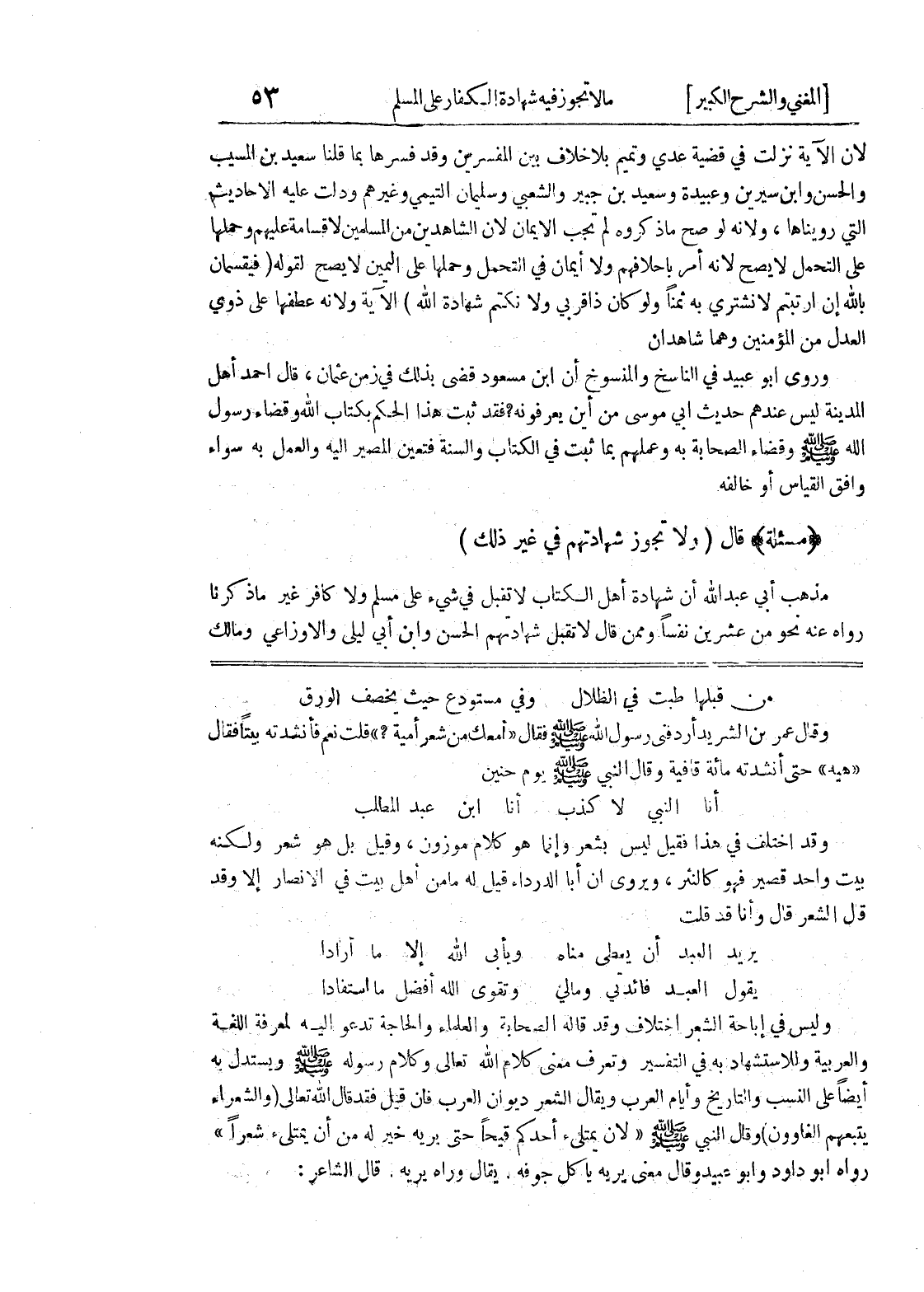 وليس في إباحة الشعر اختلاف وقد قاله الصحابة والعلماء والحاجة تدعو إليه لمعرفة اللغة والعربية وللاستشهاد به في التفسير وتعرف معنى كلام الله تعالى وكلام رسوله صلى الله عليه وسلم ويستدل به أيضاً على النسب والتاريخ وأيام العرب ويقال الشعر ديوان العرب فإن قيل فقد قال الله تعالى (والشعراء يتبهم الغاوون) وقال النبي صلى الله عليه وسلم (لأن يمتلئ أحدكم قيحاً حتى يريه خير له من أن يمتلئ شعراً) رواه أبو داود وابو عبيد وقال معنى يريه يأكل جوفه يقال ورواه يريه قال الشاعر: