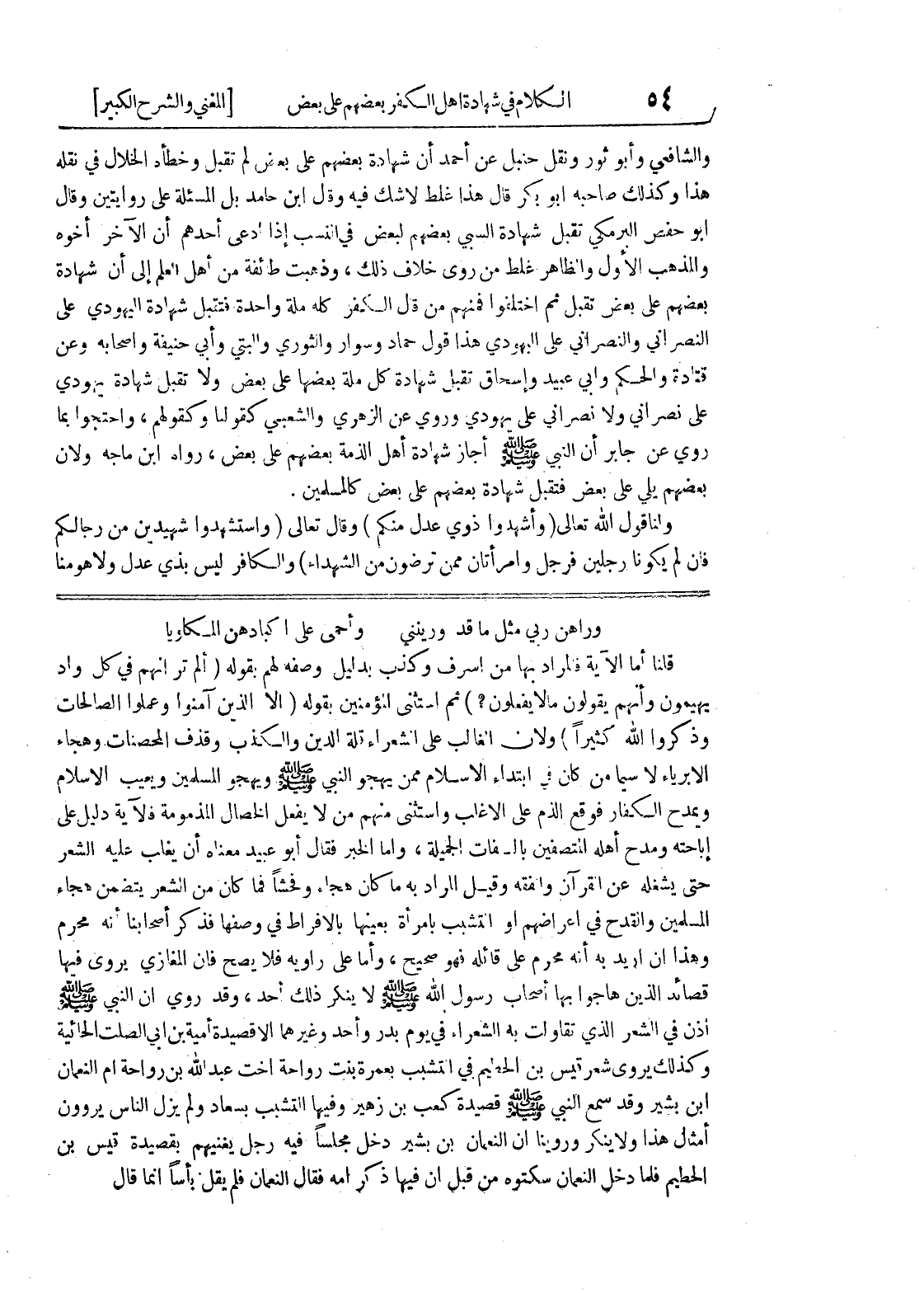 وراهن ربي مثل ما قد ورينني * واحمى على أكبادهن المكاويا قلنا أما الآية فالمراد بها من أسرف وكذب بدليل وصفه لهم بقوله (ألم ترانهم في كل واد يهيمون وأنهم يقولون ما لا يفعلون؟) ثم استثني المؤمنين بقوله (إلا الذين آمنوا وعملوا الصالحات وذكروا الله كثيرا) ولأن الغالب على الشعراء قلة الدين والكذب وقذف المحصنات وهجاء الأبرياء لا سيما من كان في ابتداء الإسلام ممن يهجو النبي صلى الله عليه وسلم ويهجو المسلمين ويعيب الإسلام ويمدح الكفار فوقع الذم على الأغلب واستثنى منهم من لا يفعل الخصال المذمومة فالآية دليل على إباحته ومدح أهله المتصفين بالصفات الجميلة، وأما الخبر فقال أبو عبيد معناه أن يغلب عليه الشعر حتى يشغله عن القرآن والفقه وقيل المراد به ما كان هجاءً وفحشاً فما كان من الشعر يتضمن هجاء المسلمين والقدح في أعراضهم أو التشبب بإمرأة بعينها بالإفراط في وصفها فذكر أصحابنا أنه محرم وهذا إن أريد به أنه محرم على قائله فهو صحيح، وأما على راويه فلا يصح فإن المغازي يروى فيها قصائد الذين هاجوا بها أصحاب رسول الله صلى الله عليه وسلم لا ينكر ذلك أحد، وقد روي أن النبي صلى الله عليه وسلم أذن في الشعر الذي تقاولت به الشعراء في يوم بدر وأحد وغيرهما إلا قصيدة أمية بن أبي الصلت الحائية وكذلك يروى شعر قيس بن الحطيم في التشبب بعمرة بنت رواحة أخت عبد الله بن رواحة أم النعمان ابن بشير وقد سمع النبي صلى الله عليه وسلم قصيدة كعب بن زهير وفيها التشبب بسعاد ولم يزل الناس يروون أمثال هذا ولا ينكر وروينا أن النعمان بن بشير دخل مجلساً فيه رجل يغنيهم بقصيدة قيس بن الحطيم فلما دخل النعمان سكتوه من قبل أن فيها ذكر أمه فقال النعمان فلم يقل بأساً إنما قال