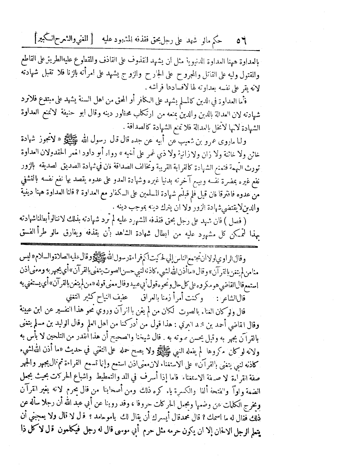 وقال الراوي لولا أن تجتمع الناس إلي لحكيت لكم قراءة رسول الله صلى الله عليه وسلم وقال عليه الصلاة والسلام (ليس منا من لم يتغن بالقرآن) وقال (ما أذن الله لشئ كإذنه لنبي حسن الصوت يتغنى بالقرآن) أي يجهر به ومعنى أذن استمع قال القاضي هو مكروه على كل حال ونحوه قول أبي عبيد وقال معنى قوله (من لم يتغن بالقرآن) أي يستغني به قال الشاعر: وكنت امرأ زمناً بالعراق * عفيف النياح كثير التغني