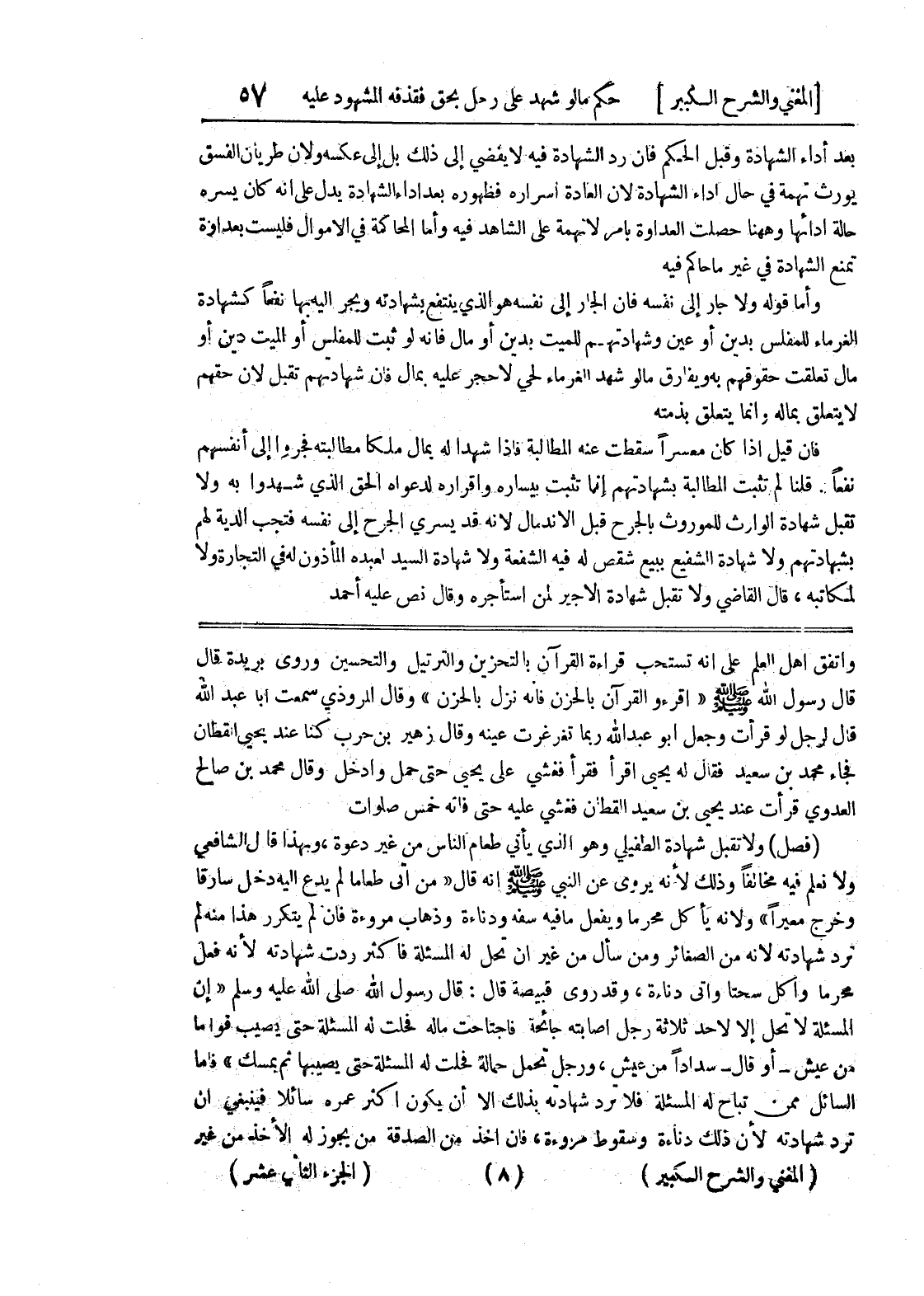 واتفق أهل العلم على أنه تستحب قراءة القرآن بالتحزين والترتيل والتحسين وروى بريدة قال قال رسول الله صلى الله عليه وسلم (اقرءو القرآن بالحزن فإنه نزل بالحزن) وقال المروذي سمعت أبا عبد الله قال لرجل لو قرأت وجعل أبو عبد الله ربما تغرغرت عينه وقال زهير بن حرب كنا عند يحيى القطان فجاء محمد بن سعيد فقال له يحيى اقرأ فقرأ فغشي على يحيى حتى حمل وأدخل وقال محمد بن صالح العدوي قرأت عند يحيى بن سعيد القطان فغشي عليه حتى فانه خمس صلوات (فصل) ولا تقبل شهادة الطفيلي وهو الذي يأتي طعام الناس من غير دعوة، وبهذا قال الشافعي ولا نعلم فيه مخالفاً وذلك لأنه يروى عن النبي صلى الله عليه وسلم أنه قال (من أتى طعاماً لم يدع إليه دخل سارقاً وخرج معيراً) ولأنه يأكل محرماً ويفعل ما فيه سفه ودناءة وذهاب مروءة فإن لم يتكرر هذا منه لم ترد شهادته لأنه من الصغائر ومن سأل من غير أن تحل له المسألة فأكثر ردت شهادته لأنه فعل محرماً وأكل سحتاً وأتى دناءة، وقد روى قبيصة قال: قال رسول الله صلى الله عليه وسلم (إن المسألة لا تحل إلا لأحد ثلاثة رجل أصابته جائحة فاجتاحت ماله فحلت له المسألة حتى يصيب قواماً