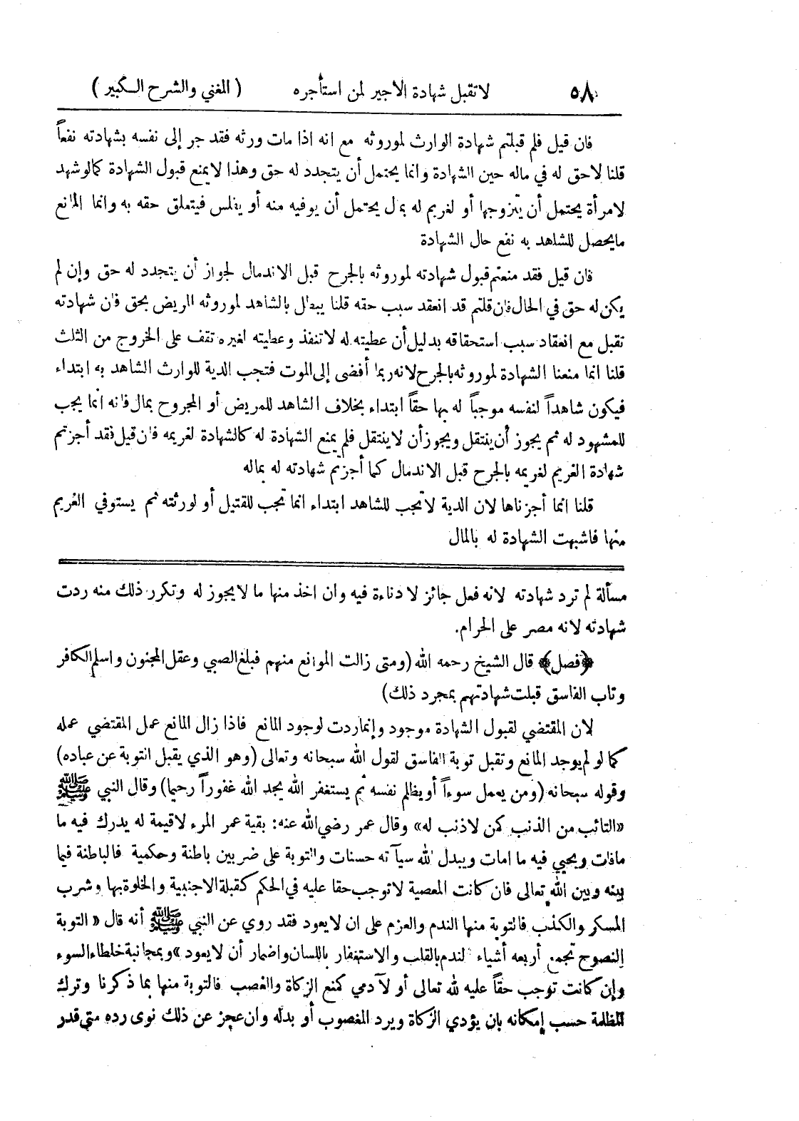 (فصل) قال الشيخ رحمه الله (ومتى زالت الموانع منهم فبلغ الصبي وعقل المجنون وأسلم الكافر وتاب الفاسق قبلت شهادتهم بمجرد ذلك) لان المقتضي لقبول الشهادة موجود وإنما ردت لوجود المانع فإذا زال المانع عمل المقتضي عمله كما لو لم يوجد المانع وتقبل توبة الفاسق لقول الله سبحانه وتعالى (وهو الذي يقبل التوبة عن عباده) وقوله سبحانه (ومن يعمل سوءا أو يظلم نفسه ثم يستغفر الله يجد الله غفورا رحيما) وقال النبي صلى الله عليه وسلم (التائب من الذنب كمن لا ذنب له) وقال عمر رضي الله عنه: بقية عمر المرء لا قيمة له يدرك فيه ما ما فات ويحيى فيه ما امات ويبدل الله سيأته حسنات والتوبة على ضربين باطنة وحكمية فالباطنة يما بينه وبين الله تعالى فإن كانت المعصية لا توجب حقاً عليه في الحكم كقبلة الأجنبية والخلوة بها وشرب المسكر والكذب فالتوبة منها الندم والعزم على أن لا يعود فقد روي عن النبي صلى الله عليه وسلم أنه قال (التوبة النصوح تجمع أربعة أشياء الندم بالقلب والاستغفار باللسان وإضمار أن لا يعود) وبمجانبة خلطاء السوء وإن كانت توجب حقاً عليه لله تعالى أو لآدمي كمنع الزكاة والغصب فالتوبة منها بما ذكرنا وترك المظلمة حسب إمكانه بأن يؤدي الزكاة ويرد المغصوب أو بدله وإن عجز عن ذلك نوى رده متى قدر