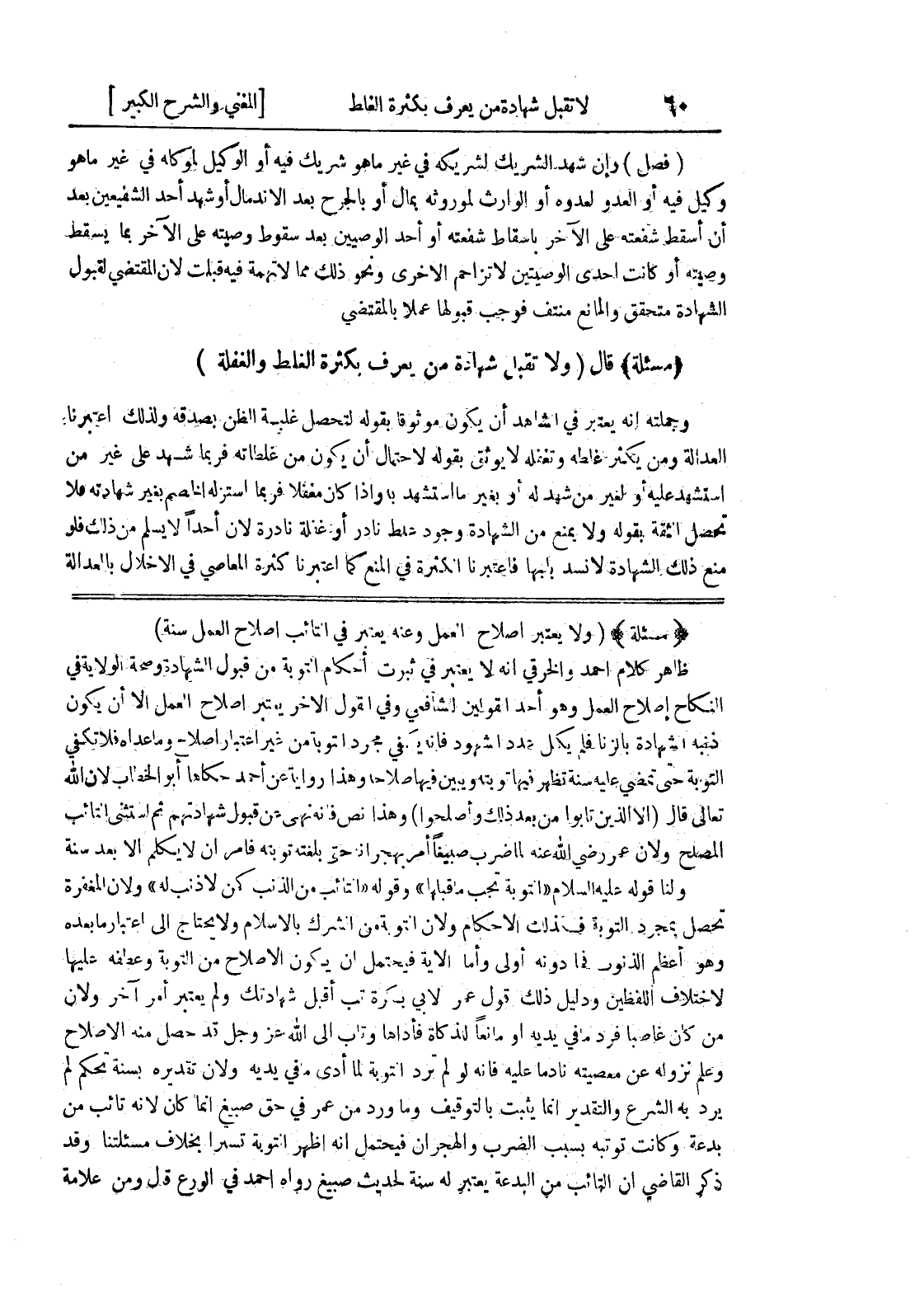 وهو أعظم الدنوب فما دونه أولى وأما الآية فيحتمل أن يكون الإصلاح من التوبة وعطفه عليها لاختلاف اللفظين ودليل ذلك قول عمر لأبي بكرة تب أقبل شهادتك ولم يعتبر أمر آخر ولأن من كان غاصباً فرد ما في يديه أو مانعا للذكاة فأداها وتاب إلى الله عزوجل قد حصل منه الإصلاح وعلم نزوله عن معصيته نادماً عليه فإنه لو لم ترد التوبة لما أدى ما في يديه ولأن تقديره بسنة تحكم لم يرد به الشرع والتقدير إنما يثبت بالتوقيف وما رود من عمر في حق صبيغ إنما كان لأنه تائب من بدعة وكانت توتبه بسبب الضرب والهجران فيحتمل أنه أظهر التوبة تستراً بخلاف مسئلتنا وقد ذكر القاضي أن التائب من البدعة يعتبر له سنة لحديث صبيغ رواه أحمد في الورع قال ومن علامة