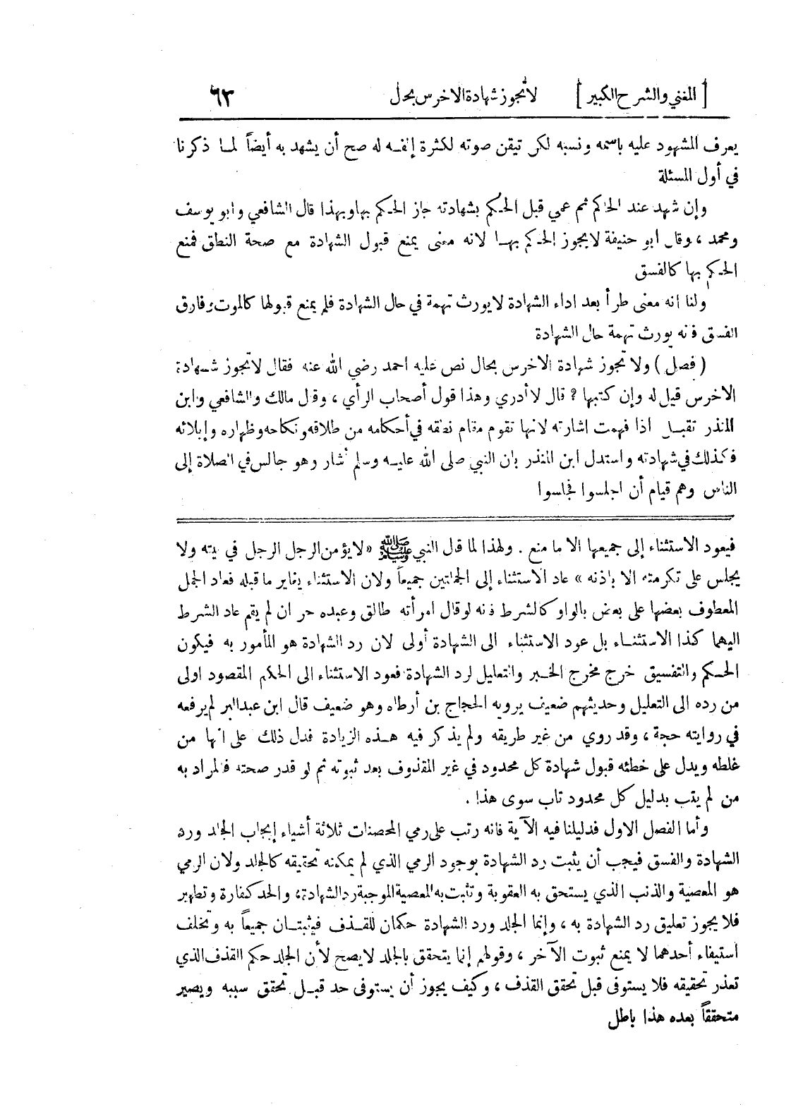 ولهذا لما قال النبي صلى الله عليه وسلم (لا يؤمن الرجل الرجل في بيته ولا يجلس على تكرمته إلا بإذنه) عاد الاستثناء إلى الجملتين جميعاً ولأن الاستثناء يغاير ما قبله فعاد الجمل المعطوف بعضها على بعض بالواو كالشرط فإنه لو قال امرأته طالق وعبده حر إن لم يقم عاد الشرط إليهما كذا الاستثناء بل عود الاستثناء إلى الشهادة أولى لأن رد الشهادة هو المأمور به فيكون الحكم والتفسيق خرج مخرج الخبر والتعليل لرد الشهادة فعود الاستثناء إلى الحكم المقصود إلى