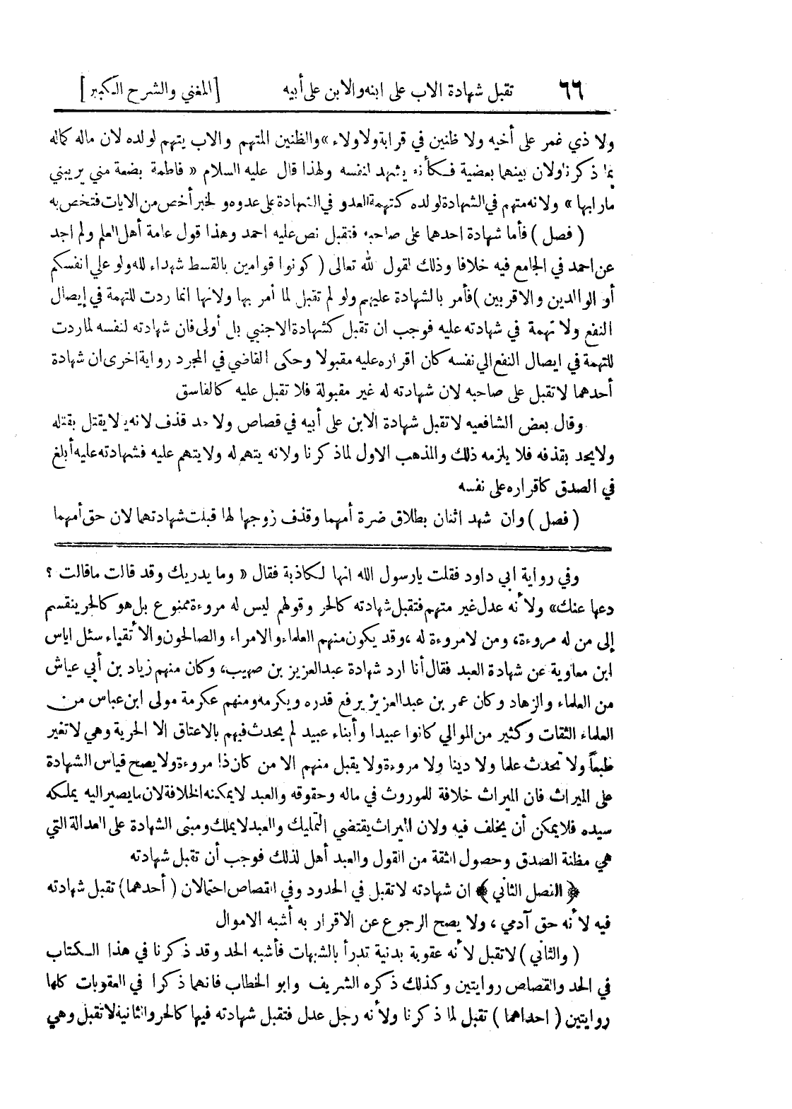 وفي رواية أبي داود فقلت يارسول الله إنها لكاذبة فقال (وما يدريك وقد قالت ما قالت؟ دعها عنك) ولأنه عدل غير متهم فتقبل شهادته كالحر وقولهم ليس له مروءة ممنوع بل هو كالحر ينقسم إلى من له مروءة، ومن لا مروءة له، وقد يكون منهم العلماء والأمراء والصالحون والأتقياء سئل إياس ابن معاوية عن شهادة العبد فقال أنا أرد شهادة عبد العزيز بن صهيب، وكان منهم زياد بن أبي عياش من العلماء والزهاد وكان عمر بن عبد العزيز يرفع قدره ويكرمه ومنهم عكرمة مولى ابن عباس من العلماء الثقات وكثير من الموالي كانوا عبيداً وأبناء عبيد لم يحدث فيهم بالاعتاق إلا الحرية وهي لا تغير طبعاً ولا تحدث علماً ولا ديناً ولا مروءة ولا يقبل منهم إلا من كان ذا مروءة ولا يصح قياس الشهادة على الميراث فإن الميراث خلافة للموروث في ماله وحقوقه والعبد لا يمكنه الخلافة لأن ما يصير إليه يملكه سيده فلا يمكن أن يخلف فيه ولأن الميراث يقتضي التمليك والعبد لا يملك ومبنى الشهادة على العدالة التي هي مظنة الصدق وحصول الثقة من القول والعبد أهل لذلك فوجب أن تقبل شهادته (الفصل الثاني) أن شهادته لا تقبل في الحدود وفي القصاص احتمالان (أحدهما) تقبل شهادته فيه لأنه حق آدمي، ولا يصح الرجوع عن الإقرار به أشبه الأموال (والثاني) لا تقبل لأنه عقوبة بدنية تدرأ بالشبهات فأشبه الحد وقد ذكرنا في هذا الكتاب في الحد والقصاص روايتين وكذلك ذكره الشريف وابو الخطاب فإنهما ذكرا في العقوبات كلها روايتين (إحداهما) تقبل لما ذكرنا ولأنه رجل عدل فتقبل شهادته فيها كالحر والثانية لا تقبل وهي