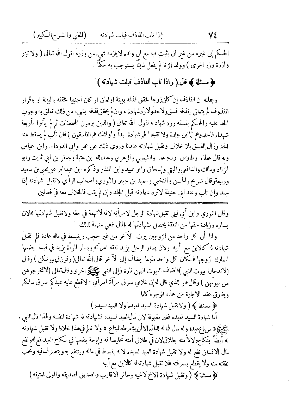 شهادته له كالابن مع أبيه ولأن يسار الرجل يزيد نفقة امرأته ويسار المرأة يزيد في قيمة بضعها المملوك لزوجها فكان كل واحد منهما يضاف إلى الآخر قال الله تعالى (وقرن في بيوتكن) وقال (لا تدخلوا بيوت النبي) فأضاف البيوت إليهن تارة وإلى النبي صلى الله عليه وسلم أخرى وقال تعالى (لا تخرجوهن من بيوتهن) وقال عمر للذي قال له أن غلامي سرق مرآة امرأتي: لا قطع عليه عبدكم سرق مالكم ويفارق عقد الإجارة من هذه الوجوه كلها (مسألة) (ولا تقبل شهادة السيد لعبده ولا العبد لسيده) أما شهادة السيد لعبده فغير مقبولة لأن مال العبد لسيده فشهادته له شهادة لنفسه ولهذا قال النبي صلى الله عليه وسلم (من باع عبداً وله مال فماله للبائع إلا أن يشترطه المبتاع) ولا نعلم في هذا خلافاً ولا تقبل شهادته له أيضاً بنكاح ولا لأمته بطلاق لأن في طلاق أمته تخليصاً له وإباحة بضعها في نكاح العبد نفع له ونفع مال الإنسان نفع له ولا تقبل شهادة العبد لسيده لأنه يتبسط في ماله وينتفع به ويتصرف فيه وتجب نفقته منه ولا يقطع بسرقته فلا تقبل شهادته له كالابن مع أبيه (مسألة) (وتقبل شهادة الأخ لأخيه وسائر الأقارب والصديق لصديقه والمولى لعتيقه)