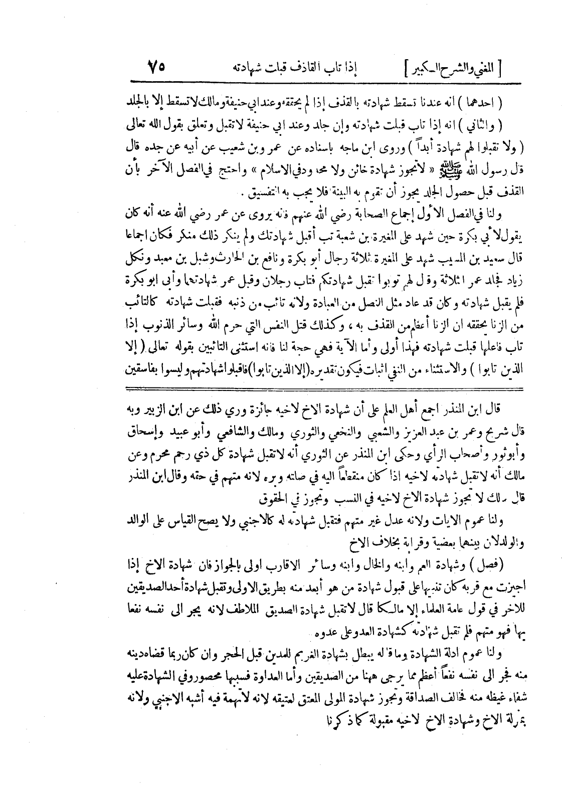 قال إبن المنذر أجمع أهل العلم على أن شهادة الأخ لأخيه جائزة وروي ذلك عن ابن الزبير وبه قال شريح وعمر بن عبد العزيز والشعبي والنخعي والثوري ومالك والشافعي وأبو عبيد وإسحاق وأبو ثور وأصحاب الرأي وحكى ابن المنذر عن الثوري أنه لا تقبل شهادة كل ذي رحم محرم وعن مالك أنه لا تقبل شهادته لأخيه إذا كان منقطعاً إليه في صلته وبره لأنه متهم في حقه وقال ابن المنذر قال مالك لا تجوز شهادة الأخ لأخيه في النسب وتجوز في الحقوق ولنا عموم الآيات ولأنه عدل غير متهم فتقبل شهادته له كالأجنبي ولا يصح القياس على الوالد والولد لأن بينهما بعضية وقرابة بخلاف الأخ (فصل) وشهادة العم وابنه والخال وابنه وسائر الأقارب أولى بالجواز فإن شهادة الأخ إذا أجيزت مع قربه كان تنبيها على قبول شهادة من هو أبعد منه بطريق الأولى وتقبل شهادة أحد الصديقين