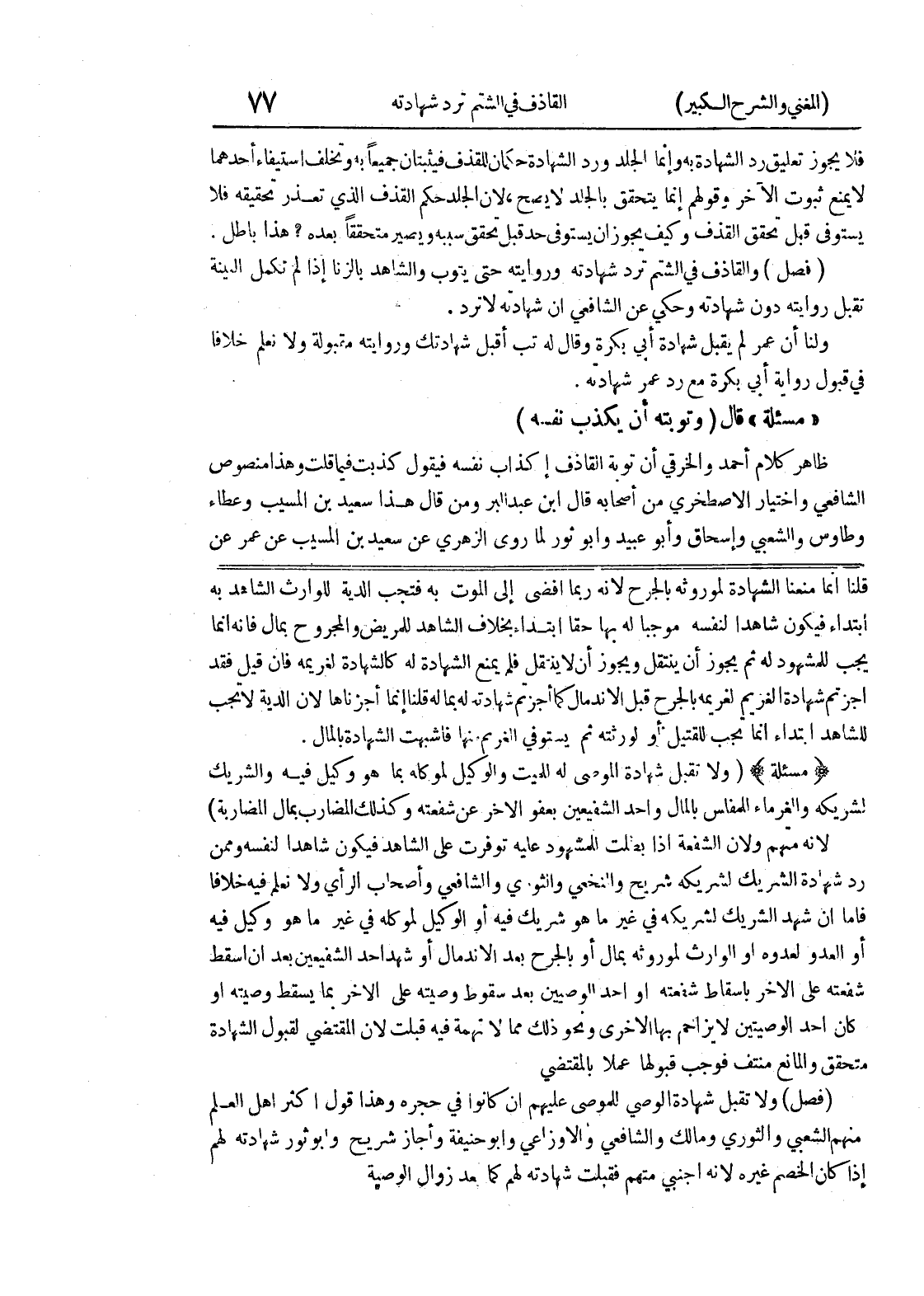 (مسألة) (ولا تقبل شهادة الموصى له للميت والوكيل لموكله بما هو وكيل فيه والشريك لشريكه والغرماء للمفلس بالمال وأحد الشفيعين بعفو الآخر عن شفعته وكذلك المضارب بمال المضاربة) لأنه متهم ولأن الشفعة إذا بطلت للمشهود عليه توفرت على الشاهد فيكون شاهداً لنفسه وممن رد شهادة الشريك لشريكه شريح والنخعي والثوري والشافعي وأصحاب الرأي ولا نعلم فيه خلافاً فأما إن شهد الشريك لشريكه في غير ما هو شريك فيه أو الوكيل لموكله في غير ما هو وكيل فيه أو العدو لعدوه أو الوارث لموروثه بمال أو بالجرح بعد الاندمال أو شهد أحد الشفيعين بعد أن أسقط شفعته على الأخر بإسقاط شفعته أو أحد الوصيين بعد سقوط وصيته على الآخر بما يسقط وصيته أو كان أحد الوصيتين لا يزاحم بها الأخرى ونحو ذلك مما لا تهمة فيه قبلت لان المقتضي لقبول الشهادة متحقق والمانع منتف فوجب قبولها عملاً بالمقتضي (فصل) ولا تقبل شهادة الوصي للموصى عليهم إن كانوا في حجره وهذا قول أكثر أهل العلم منهم الشعبي والثوري ومالك والشافعي والاوزاعي وابو حنيفة وأجاز شريح وابو ثور شهادته لهم إذا كان الخصم غيره لأنه أجنبي متهم فقبلت شهادته لهم كما بعد زوال الوصية