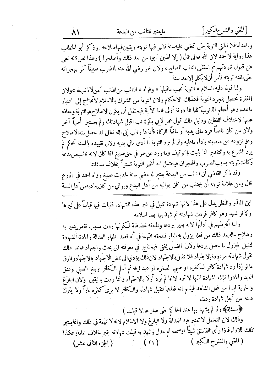 ابن المنذر والنظر يدل على هذا لأنها شهادة تقبل في غير هذه الشهادة فقبلت فيها قياساً على غيرها وكما لو شهد وهو كافر فردت شهادته ثم شهد بها بعد إسلامه ولنا أنه متهم في أدائها لأنه يعير بردها وتلحقه غضاضة لكونها ردت بسبب نقص يتغير به