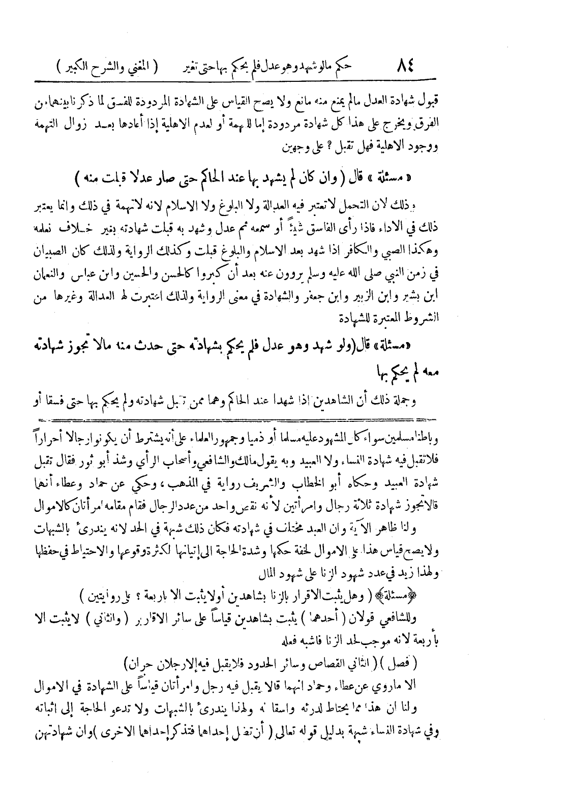 ولا يصح قياس هذا على الاموال لخفة حكمها وشدة الحاجة إلى إتيانها لكثرة وقوعها والاحتياط في حفظها ولهذا زيد في عدد شهود الزنا على شهود المال (مسألة) (وهل يثبت الإقرار بالزنا بشاهدين أو لا يثبت إلا بأربعة؟ على روايتين) وللشافعي قولان (أحدهما) يثبت بشاهدين قياس على سائر الاقاربر (والثاني) لا يثبت إلا بأربعة لأنه موجب لحد الزنا فأشبه فعله (فصل) (الثاني القصاص وسائر الحدود فلا يقبل فيه إلا رجلان حران) إلا ما روي عن عطاء وحماد أنهما قالا يقبل فيه رجل وامرأتان قياساً على الشهادة في الأموال ولنا أن هذا مما يحتاط لدرئه واسقا له ولهذا يندرئ بالشبهات ولا تدعو الحاجة إلى إثباته وفي شهادة النساء شسبهة بدليل قوله تعالى (أن تضل إحداهما فتذكر إحداهما الأخرى) وأن شهادتهن