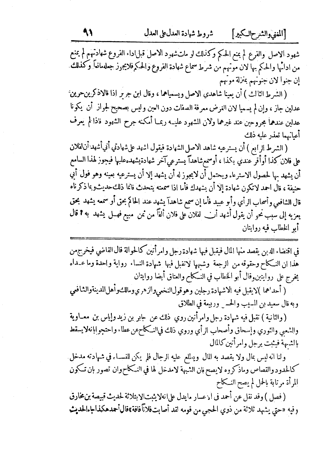 في اقتضاء الدين يقصد منها المال فيقبل فيها شهادة رجل وامرأتين كالحوالة قال القاضي فيخرج من هذا أن النكاح وحقوقه من الرجعة وشبهها لا تقبل فيها شهادة النساء رواية واحدة وما عداه يخرج على روايتين وقال أبو الخطاب في النكاح والعتاق أيضاً روايتان (أحدهما) لا يقبل فيه إلا شهادة رجلين وهو قول النخعي والزهري ومالك وأهل المدينة والشافعي وبه قال سعيد بن المسيب والحسن وربيعة في الطلاق (والثانية) تقبل فيه شهادة رجل وامرأتين روي ذلك عن جابر بن زيد وأياس بن معاوية والشعبي والثوري واسحاق وأصحاب الرأي وروي ذلك في النكاح عن عطاء واحتجوا بأنه لا يسقط بالشبهة فيثبت يرجل وامرأتين كالمال ولنا أنه ليس بمال ولا يقصد به المال ويطلع عليه الرجال فلم يكن للنساء في شهادته مدخل كالحدود والقصاص وما ذكروه لا يصح فإن الشبهة لا مدخل لها في النكاح وإن تصور بان تكون المرأة مرتابة بالحمل لم يصح النكاح