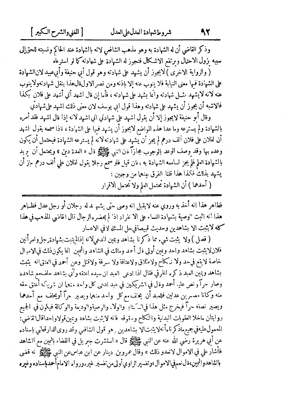 فظاهر هذا أنه أخذ به وروي عنه لا يقبل أنه وصى حتى يشهد له رجلان أو رجل عدل فظاهر هذا أنه أثبت الوصية بشهادة النساء على الانفراد إذا لم يحضره الرجال قال القاضي المذهب في هذا كله لا يثبت إلا بشاهدين وحديث قبيصة في حل المسألة لا في الإعسار (فصل) ولا يثبت شئ مما ذكرنا بشاهد ويمين المدعي لأنه إذا لم يثبت بشهادة رجل وامرأتين فلأن لا يثبت بشاهد واحد ويمين أولى قال أحمد ومالك في الشاهد واليمين إنما يكون ذلك في الأموال خاصة لا يقع في حد ولا نكاح ولا طلاق ولا عتاقة ولا سرقة ولا قتل وعن أحمد في العتق أنه يثبت بشاهد ويمين العبد ذكره الخرقي فقال إذا ادعى العبد أن سيده أعتقه وأتى بشاهد حلف مع شاهده وصار حراً ونص عليه أحمد وقال في الشريكين في عبد إدعى كل واحد منهما أن شريكه أعتق حقه منه وكانا معسرين عدلين فللعبد أن يحلف مع كل واحد منهما ويصير حراً أو يحلف مع أحدهما ويصير نصفه حراً فيخرج مثل هذا في الكتاب والولاء والوصية والوديعة والوكالة فيكون في الجميع روايتان ما خلا العقوبات البدنية والنكاح وحقوقه فإنه لا يثبت بشاهد ويمين قولاً واحداً قال القاضي: المعمول عليه في جميع ما ذكرناه أنه لا يثبت إلا بشاهدين وهو قول الشافعي وقد روى الدارقطني بإسناده عن أبي هريرة رضي الله عنه عن النبي صلى الله عليه وسلم قال (استشرت جبريل في القضاء باليمين مع الشاهد فأشار علي في الأموال لا تعدو ذلك) وقال عمرو بن دينار عن ابن عباس عن النبي صلى الله عليه وسلم نه قضى بالشاهد واليمين، قال نعم في الأموال، وتفسير الراوي أولى من تفسير غيره ورواه الإمام أحمد بإسناده وغيره
