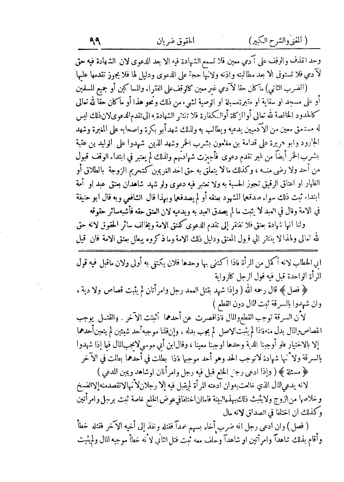 والقتل يوجب القصاص والمال بدل منه فإذا لم يثبت الأصل لم يجب بدله، وإن قلنا موجبه أحد شيئين لم يتعين أحدهما إلا بالاختيار فلو أوجبنا الدية وحدها أوجبنا معيناً، وقال ابن أبي موسى لا يجب المال فيما إذا شهدوا بالسرقة ولأنها شهادة لا توجب الحد وهو أحد موجبها فإذا بطلت في أحدهما بطلت في الآخر (مسألة) (وإذا ادعى رجل الخلع قبل فيه رجل وامرأتان أو شاهد ويمين المدعي) لأنه يدعي المال الذي خالعت به وإن ادعته المرأة لم يقبل فيه إلا رجلان لأنها لا تقصد منه إلا الفسخ وخلاصها من الزوج ولا يثبت ذلك بهذه البينة فأما إن اختلفا في عوض الخلع خاصة ثبت برجل وامرأتين وكذلك إن اختلفا في الصداق لأنه مال (فصل) وإن ادعى رجل أنه ضرب أخاه بسهم عمداً فقتله ونفذ إلى أخيه الآخر فقتله خطأ وأقام بذلك شاهداً وامرأتين أو شاهداً وحلف معه ثبت قتل الثاني لأنه خطأ موجبه المال ولم يثبت