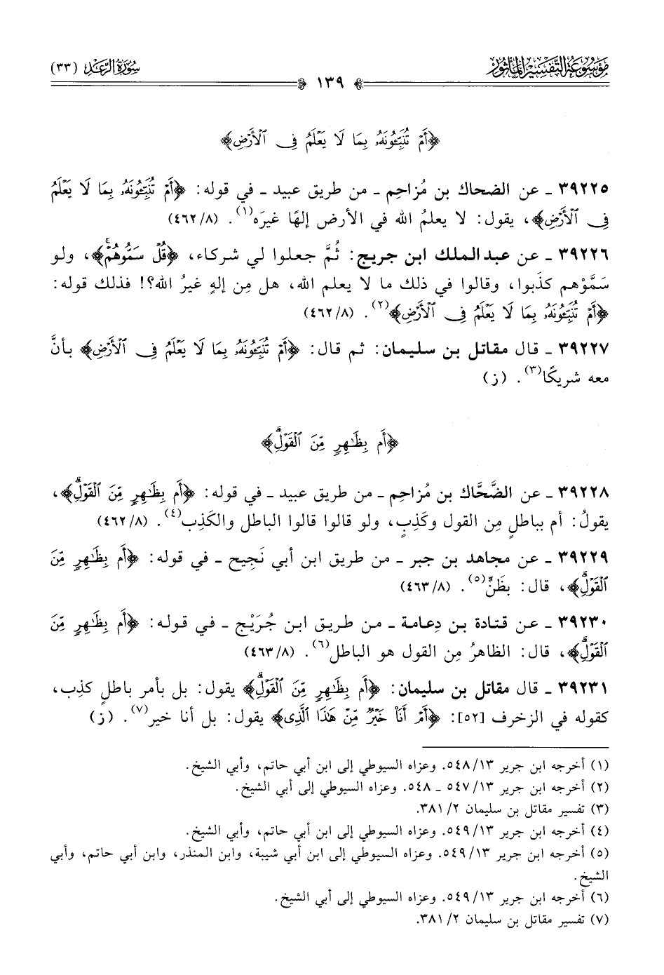 ٣٩٢٢٦ - عن عبد الملك ابن جريج: ثُمَّ جعلوا لي شركاء، {قُل سمُّوهم}، ولو سَمَّوْهم كذَبوا، وقالوا في ذلك ما لا يعلم الله، هل مِن إلهٍ غيرُ الله؟! فذلك قوله: {أم تنبئونه بما لا يعلمُ في الأرض} (¬٢). (٨/ ٤٦٢)