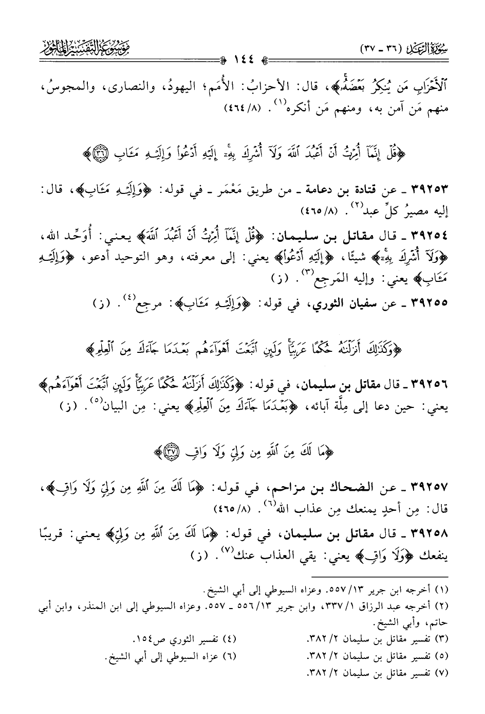 ٣٩٢٥٤ - قال مقاتل بن سليمان: {قل إنما أمرت أن أعبد الله} يعني: أُوَحِّد الله، {ولا أشرك به} شيئًا، {إليه أدعوا} يعني: إلى معرفته، وهو التوحيد أدعو، {وإليه مآب} يعني: وإليه المَرجِع (¬٣). (ز)
