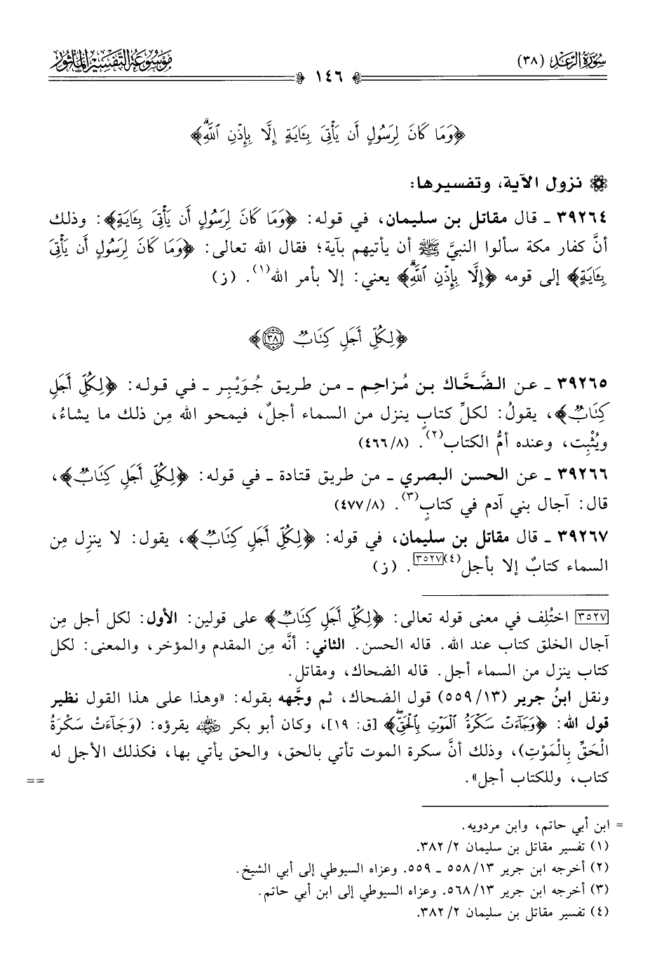 ٣٩٢٦٥ - عن الضَّحّاك بن مُزاحِم -من طريق جُوَيْبِر- في قوله: {لكلّ أجلٍ كتابٌ}، يقولُ: لكلِّ كتابٍ ينزل من السماء أجلٌ، فيمحو الله مِن ذلك ما يشاءُ، ويُثْبِت، وعنده أمُّ الكتاب (¬٢). (٨/ ٤٦٦)