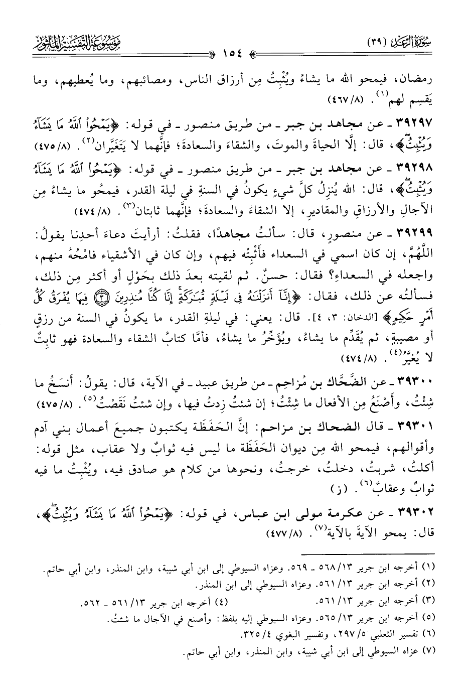 ٣٩٢٩٨ - عن مجاهد بن جبر -من طريق منصور- في قوله: {يمحُوا الله ما يشاءُ ويُثبتُ}، قال: الله يُنزِلُ كلَّ شيءٍ يكونُ في السنةِ في ليلة القدر، فيمحُو ما يشاءُ مِن الآجالِ والأرزاقِ والمقاديرِ، إلا الشقاءَ والسعادةَ؛ فإنّهما ثابتان (¬٣). (٨/ ٤٧٤)