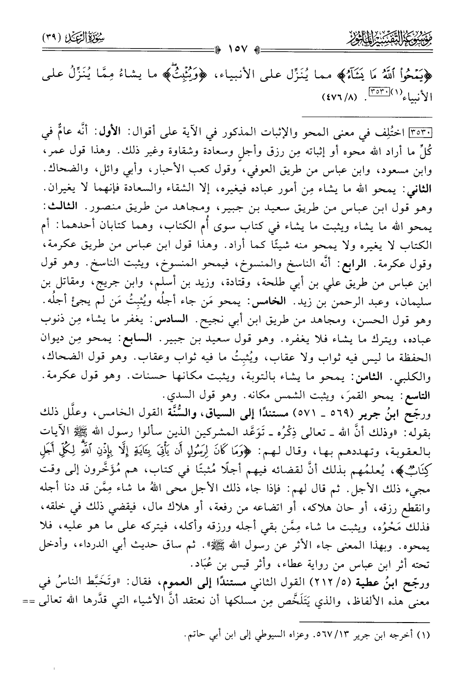 [٣٥٣٠] اختُلِف في معنى المحو والإثبات المذكور في الآية على أقوال: الأول: أنّه عامٌّ في كُلِّ ما أراد الله محوه أو إثباته مِن رزق وأجلٍ وسعادة وشقاوة وغير ذلك. وهذا قول عمر، وابن مسعود، وابن عباس من طريق العوفي، وقول كعب الأحبار، وأبي وائل، والضحاك. الثاني: يمحو الله ما يشاء مِن أمور عباده فيغيره، إلا الشقاء والسعادة فإنهما لا يغيران. وهو قول ابن عباس من طريق سعيد بن جبير، ومجاهد من طريق منصور. الثالث: يمحو الله ما يشاء ويثبت ما يشاء في كتاب سوى أُم الكتاب، وهما كتابان أحدهما: أم الكتاب لا يغيره ولا يمحو منه شيئًا كما أراد. وهذا قول ابن عباس من طريق عكرمة، وقول عكرمة. الرابع: أنّه الناسخ والمنسوخ، فيمحو المنسوخ، ويثبت الناسخ. وهو قول ابن عباس من طريق علي بن أبي طلحة، وقتادة، وزيد بن أسلم، وابن جريج، ومقاتل بن سليمان، وعبد الرحمن بن زيد. الخامس: يمحو مَن جاء أجلُه ويُثبِتُ مَن لم يجئْ أجلُه. وهو قول الحسن، ومجاهد من طريق ابن أبي نجيح. السادس: يغفر ما يشاء مِن ذنوب عباده، ويترك ما يشاء فلا يغفره. وهو قول سعيد بن جبير. السابع: يمحو مِن ديوان الحفظة ما ليس فيه ثواب ولا عقاب، ويُثبِتُ ما فيه ثواب وعقاب. وهو قول الضحاك، والكلبي. الثامن: يمحو ما يشاء بالتوبة، ويثبت مكانها حسنات. وهو قول عكرمة. التاسع: يمحو القمرَ، ويثبت الشمس مكانه. وهو قول السدي.