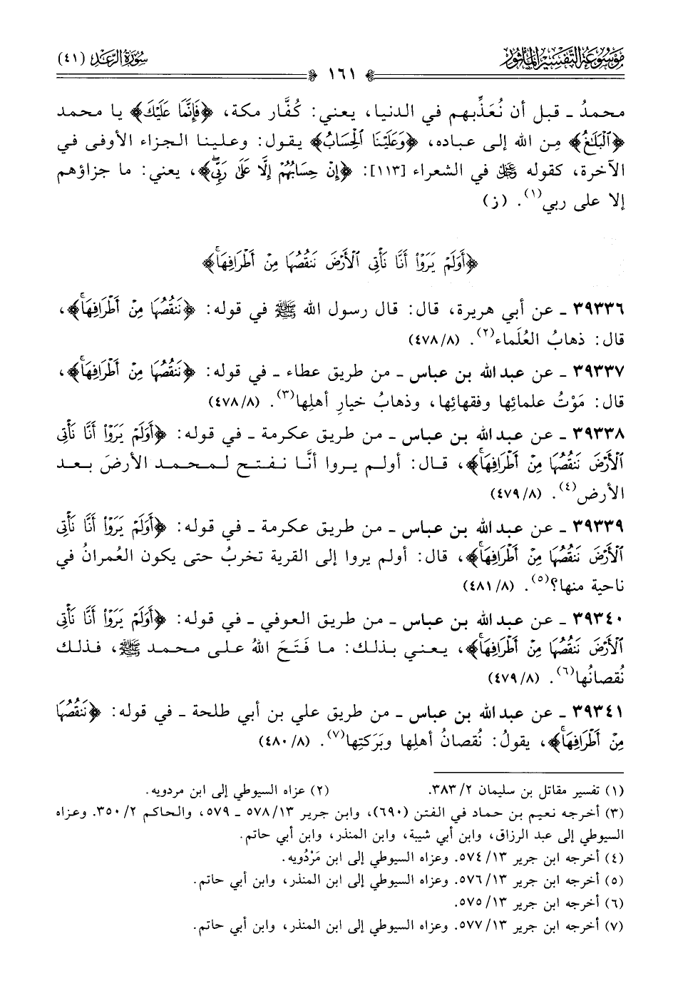 ٣٩٣٣٩ - عن عبد الله بن عباس -من طريق عكرمة- في قوله: {أو لم يَروا أنّا نأتي الأرضَ ننقصها من أطرافها}، قال: أولم يروا إلى القرية تخربُ حتى يكون العُمرانُ في ناحية منها؟ (¬٥). (٨/ ٤٨١)