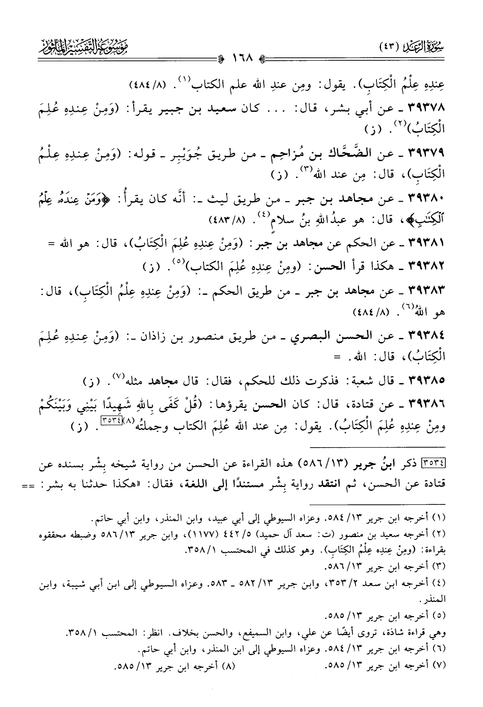 ٣٩٣٨٣ - عن مجاهد بن جبر -من طريق الحكم-: (ومِن عِندِهِ عِلْمُ الكِتابِ)، قال: هو اللهُ (¬٦). (٨/ ٤٨٤)
