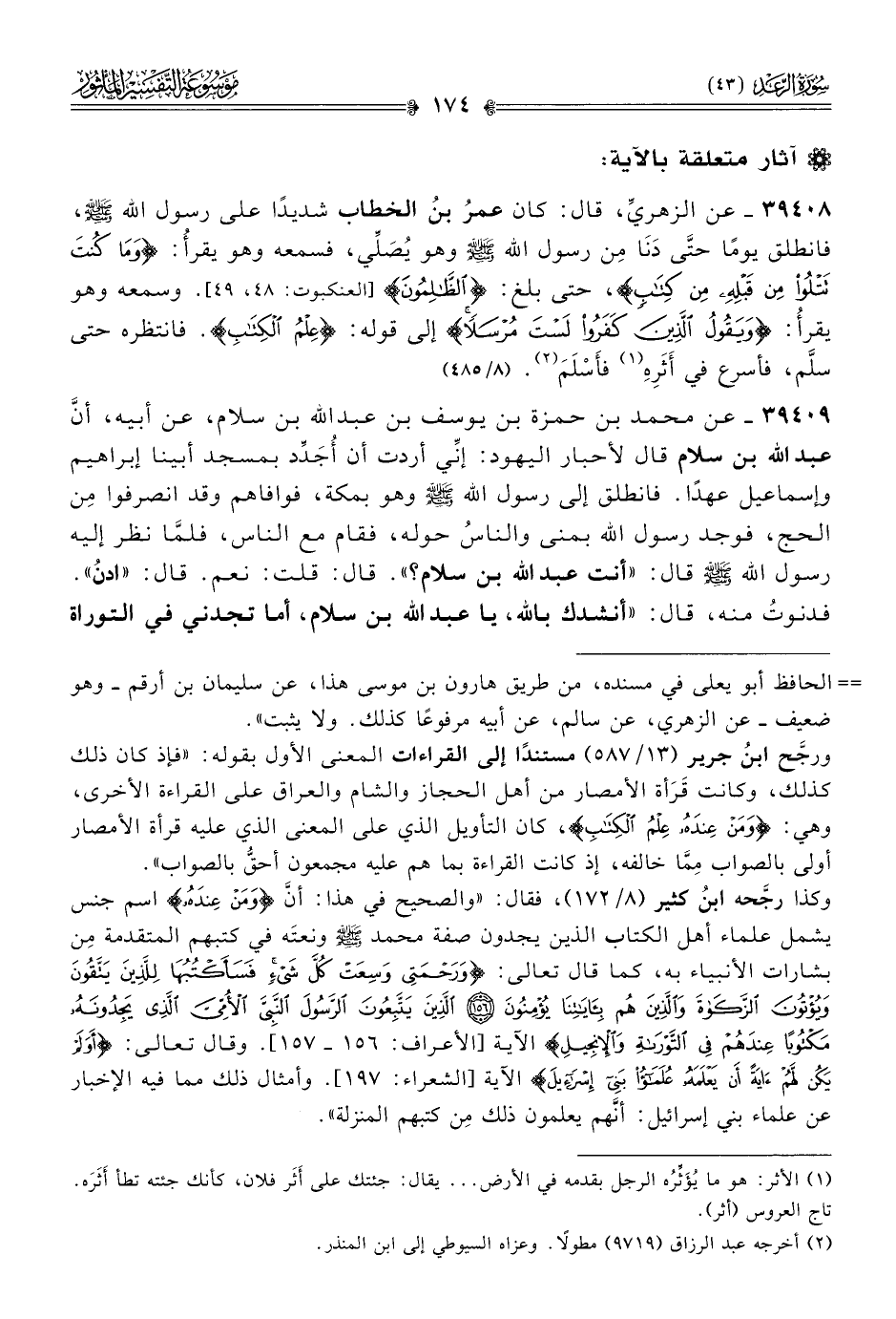 ٣٩٤٠٩ - عن محمد بن حمزة بن يوسف بن عبد الله بن سلام، عن أبيه، أنّ عبد الله بن سلام قال لأحبار اليهود: إنِّي أردت أن أُجَدِّد بمسجد أبينا إبراهيم وإسماعيل عهدًا. فانطلق إلى رسول الله - صلى الله عليه وسلم - وهو بمكة، فوافاهم وقد انصرفوا مِن الحج، فوجد رسول الله بمنى والناسُ حوله، فقام مع الناس، فلمّا نظر إليه رسول الله - صلى الله عليه وسلم - قال: «أنت عبد الله بن سلام؟». قال: قلت: نعم. قال: «ادنُ». فدنوتُ منه، قال: «أنشدك بالله، يا عبد الله بن سلام، أما تجدني في التوراة