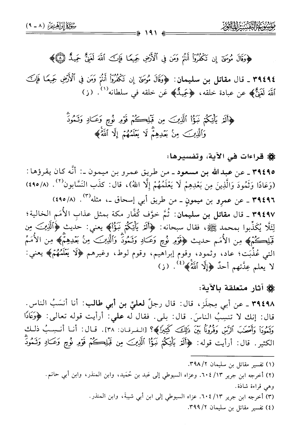 ٣٩٤٩٥ - عن عبد الله بن مسعود -من طريق عمرو بن ميمون- أنّه كان يقرؤها: (وعادًا وثَمُودَ والَّذِينَ مِن بَعْدِهِمْ لا يَعْلَمُهُمْ إلّا اللهُ)، قال: كذَب النَسّابون (¬٢). (٨/ ٤٩٥)
