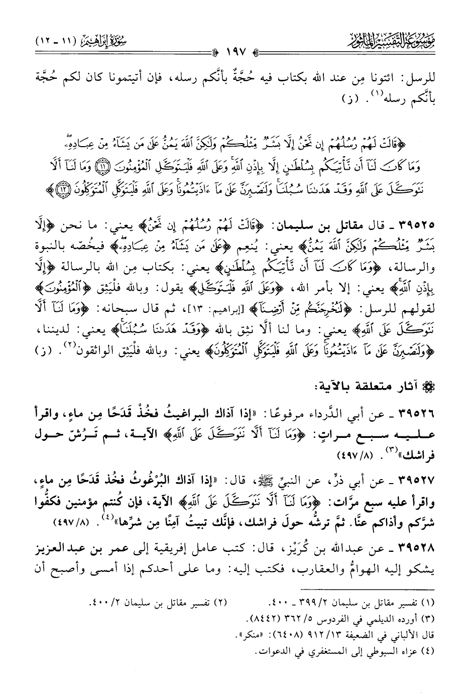٣٩٥٢٦ - عن أبي الدَّرداء مرفوعًا: «إذا آذاك البراغيثُ فخُذْ قَدَحًا مِن ماءٍ، واقرأ عليه سبع مراتٍ: {وما لنا ألّا نَتَوَكَّلَ على الله} الآية، ثم تَرُشّ حول فراشك» (¬٣). (٨/ ٤٩٧)