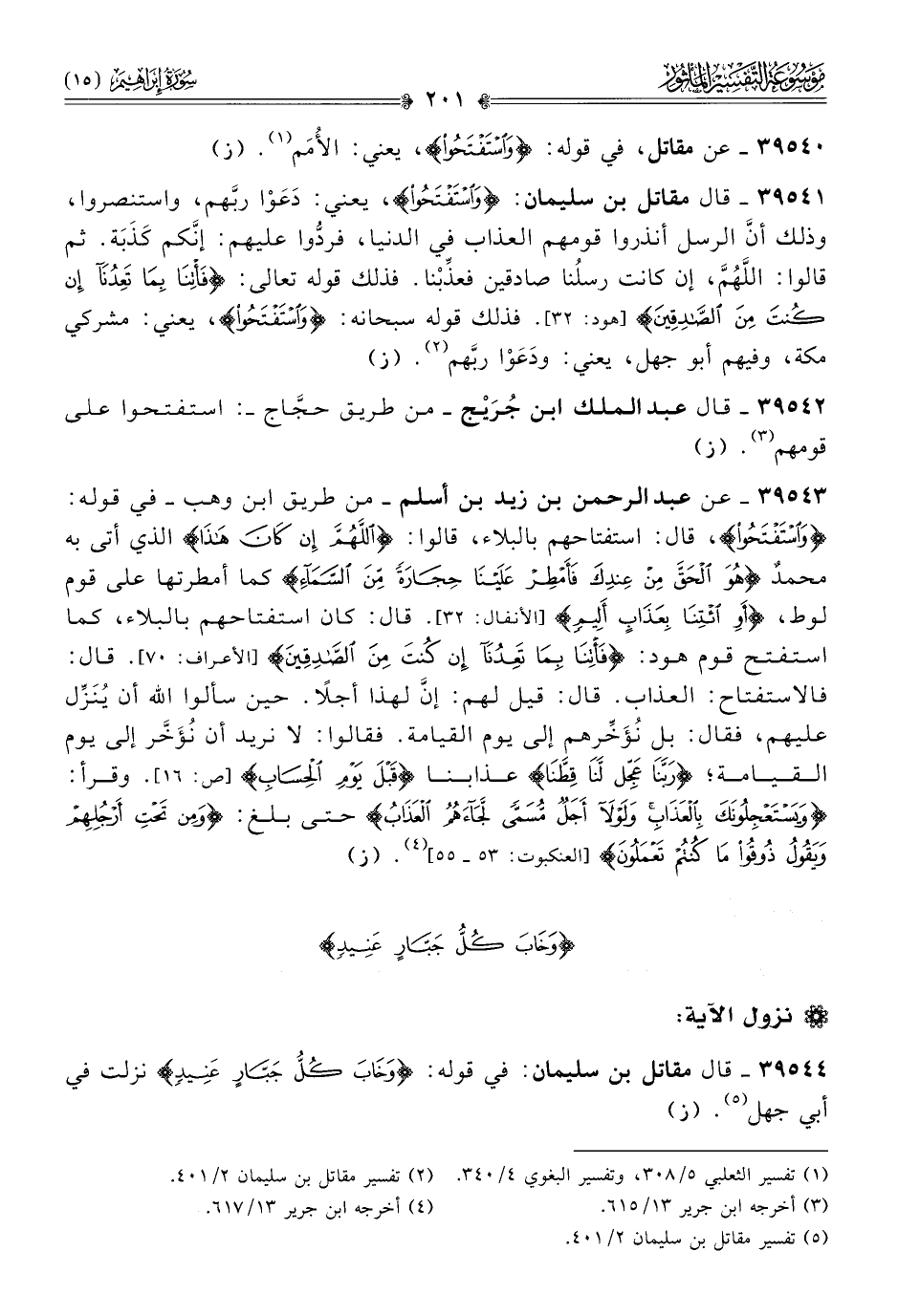 ٣٩٥٤٣ - عن عبد الرحمن بن زيد بن أسلم -من طريق ابن وهب- في قوله: {واستفتحوا}، قال: استفتاحهم بالبلاء، قالوا: {اللهم إن كان هذا} الذي أتى به محمدٌ {هو الحق من عندك فأمطر علينا حجارة من السماء} كما أمطرتها على قوم لوط، {أو ائتنا بعذاب أليم} [الأنفال: ٣٢]. قال: كان استفتاحهم بالبلاء، كما استفتح قوم هود: {ائتنا بما تعدنا إن كنت من الصادقين} [الأعراف: ٧٠]. قال: فالاستفتاح: العذاب. قال: قيل لهم: إنّ لهذا أجلًا. حين سألوا الله أن يُنَزِّل عليهم، فقال: بل نُؤَخِّرهم إلى يوم القيامة. فقالوا: لا نريد أن نُؤَخَّر إلى يوم القيامة؛ {ربنا عجل لنا قطنا} عذابنا {قبل يوم الحساب} [ص: ١٦]. وقرأ: {ويستعجلونك بالعذاب ولولا أجل مسمى لجاءهم العذاب} حتى بلغ: {ومن تحت أرجلهم، ويقول ذوقوا ما كنتم تعملون} [العنكبوت: ٥٣ - ٥٥] (¬٤). (ز)