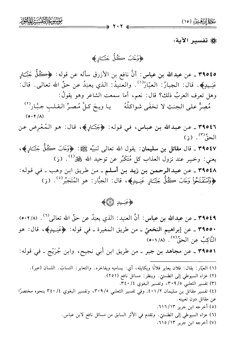 ٣٩٥٤٥ - عن عبد الله بن عباس: أنّ نافع بن الأزرق سأله عن قوله: {كلٌّ جبّار عنيدٍ}. قال: الجبارُ: العيّارُ (¬١). والعنيدُ: الذي يعنِدُ عن حقِّ الله تعالى. قال: وهل تعرف العربُ ذلك؟ قال: نعم، أما سمعت الشاعر وهو يقولُ: