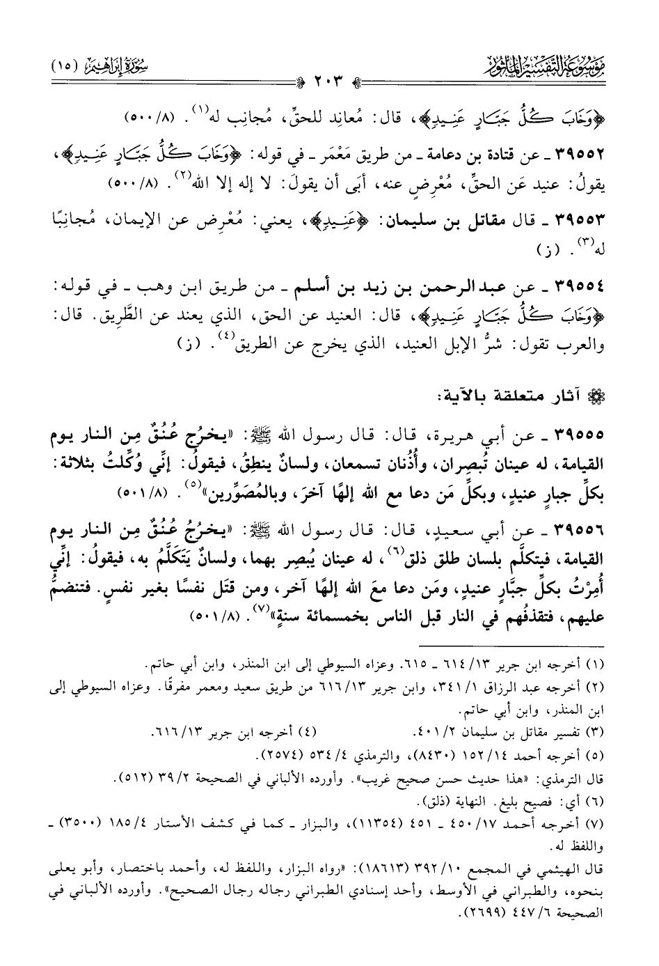 ٣٩٥٥٤ - عن عبد الرحمن بن زيد بن أسلم -من طريق ابن وهب- في قوله: {وخاب كل جبار عنيد}، قال: العنيد عن الحق، الذي يعند عن الطَّرِيق. قال: والعرب تقول: شرُّ الإبل العنيد، الذي يخرج عن الطريق (¬٤). (ز)