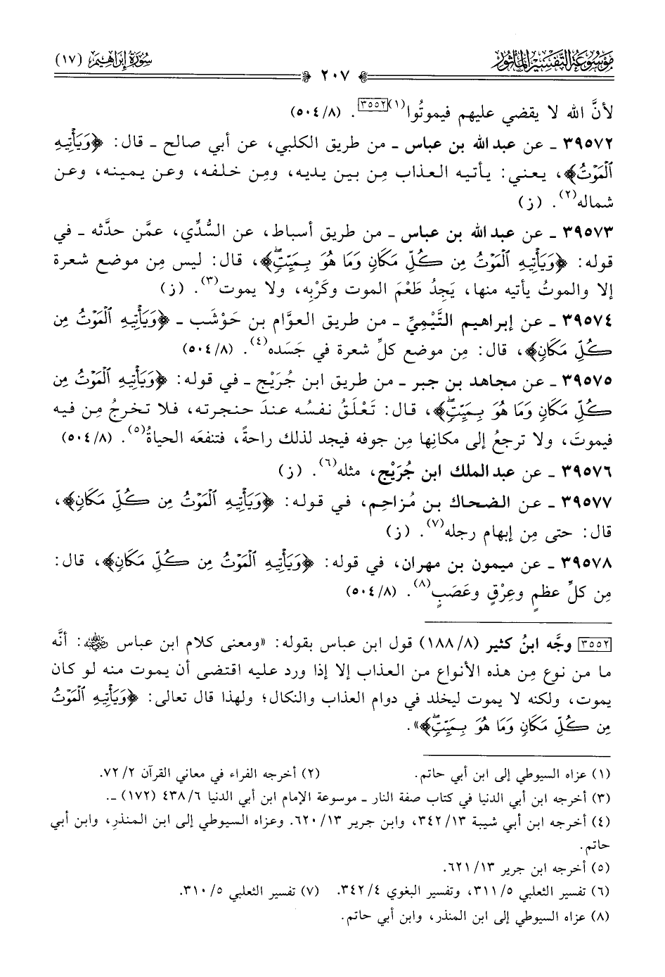 [٣٥٥٢] وجَّه ابنُ كثير (٨/ ١٨٨) قول ابن عباس بقوله: «ومعنى كلام ابن عباس?: أنّه ما من نوع مِن هذه الأنواع من العذاب إلا إذا ورد عليه اقتضى أن يموت منه لو كان يموت، ولكنه لا يموت ليخلد في دوام العذاب والنكال؛ ولهذا قال تعالى: {ويَأْتِيهِ المَوْتُ مِن كُلِّ مَكانٍ وما هُوَ بِمَيِّتٍ}».