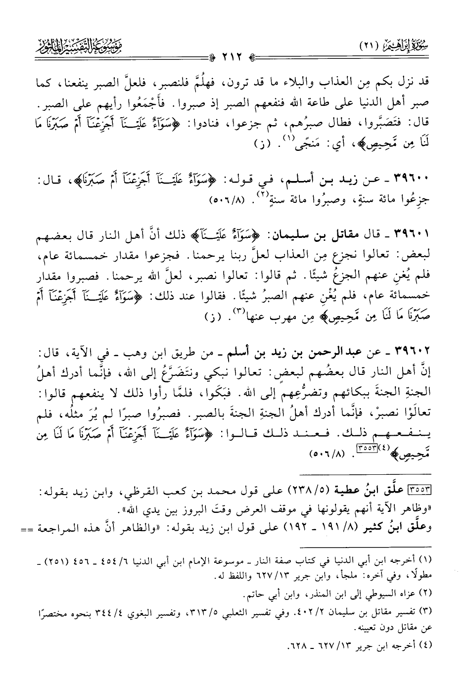 ٣٩٦٠٢ - عن عبد الرحمن بن زيد بن أسلم -من طريق ابن وهب- في الآية، قال: إنّ أهل النار قال بعضُهم لبعضٍ: تعالوا نبكي ونتَضَرَّعُ إلى الله، فإنّما أدرك أهلُ الجنةِ الجنةَ ببكائهم وتضرُّعِهم إلى الله. فبَكَوا، فلمّا رأوا ذلك لا ينفعهم قالوا: تعالَوْا نصبرْ، فإنّما أدرك أهلُ الجنةِ الجنةَ بالصبر. فصبرُوا صبرًا لم يُرَ مثلُه، فلم ينفعهم ذلك. فعند ذلك قالوا: {سواء علينا أجزعنا أم صبرنا ما لنا من محيص} (¬٤) [٣٥٥٣]. (٨/ ٥٠٦)
