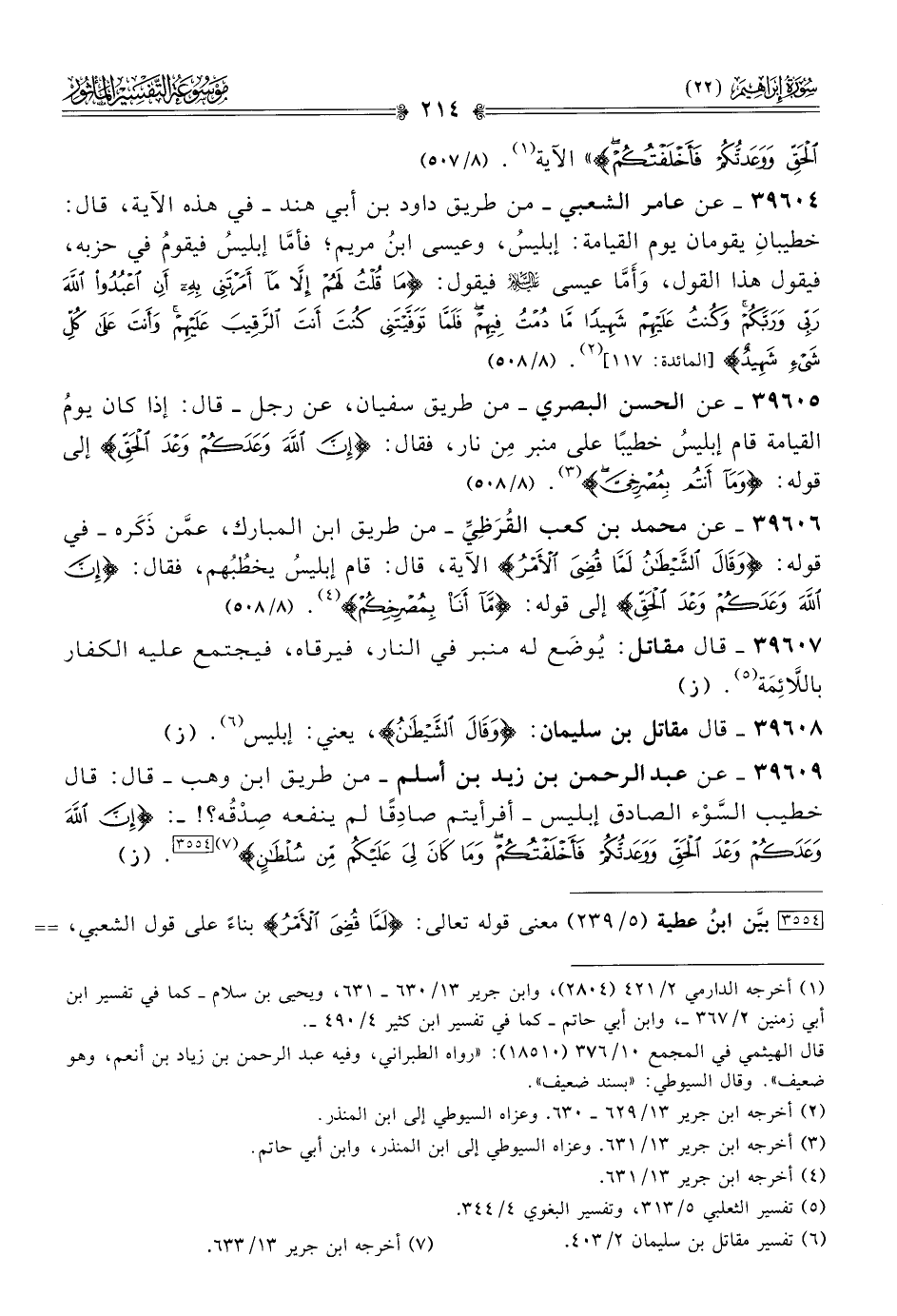 ٣٩٦٠٦ - عن محمد بن كعب القُرَظِيِّ -من طريق ابن المبارك، عمَّن ذَكَره- في قوله: {وقال الشيطانُ لمّا قضي الأمر} الآية، قال: قام إبليسُ يخطُبُهم، فقال: {إنّ اللهَ وعدكُم وعْد الحقِّ} إلى قوله: {ما أنا بمصرخكم} (¬٤). (٨/ ٥٠٨)