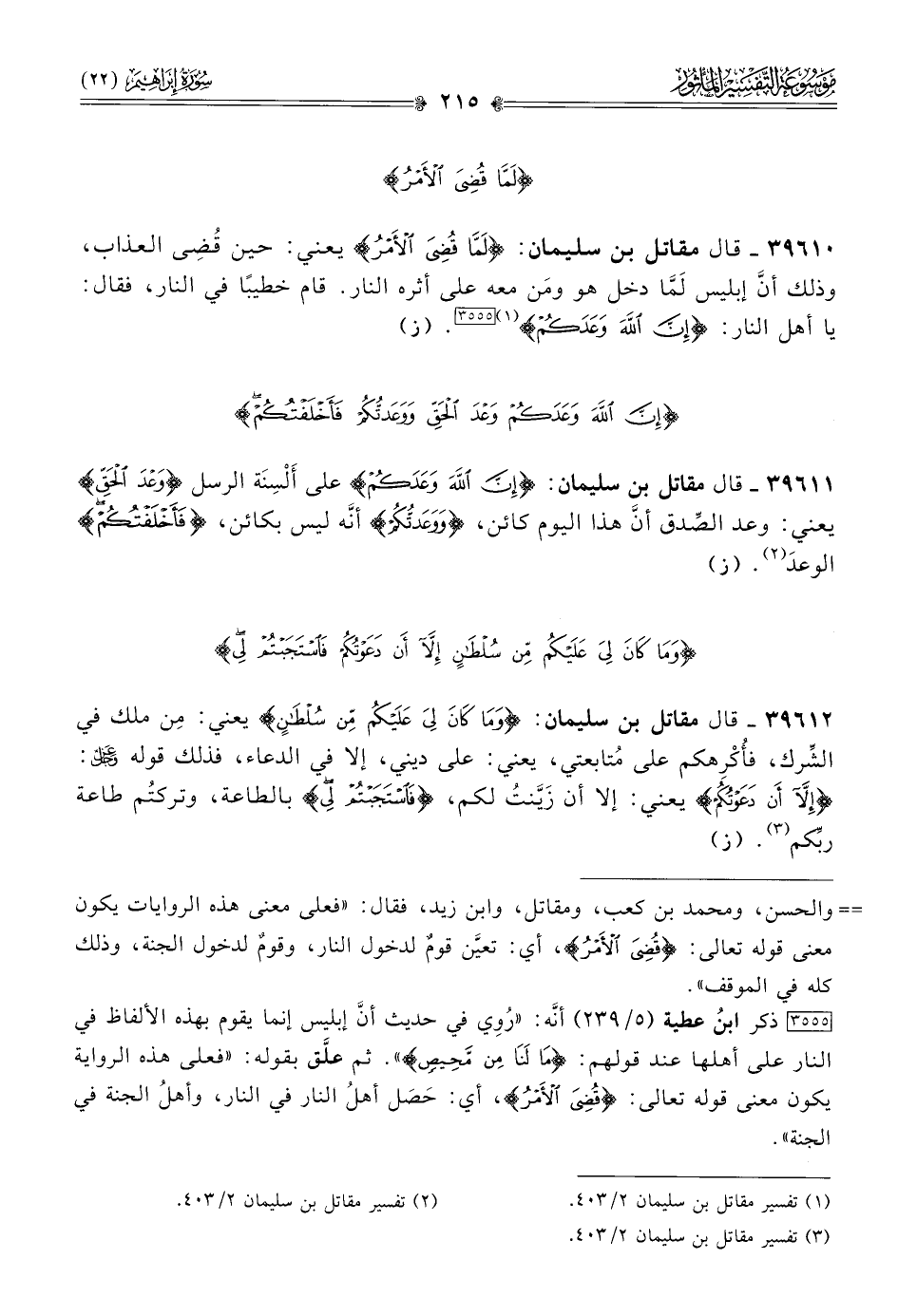 ٣٩٦١٠ - قال مقاتل بن سليمان: {لما قضي الأمر} يعني: حين قُضِى العذاب، وذلك أنّ إبليس لَمّا دخل هو ومَن معه على أثره النار. قام خطيبًا في النار، فقال: يا أهل النار: {إن الله وعدكم ... } (¬١) [٣٥٥٥]. (ز)